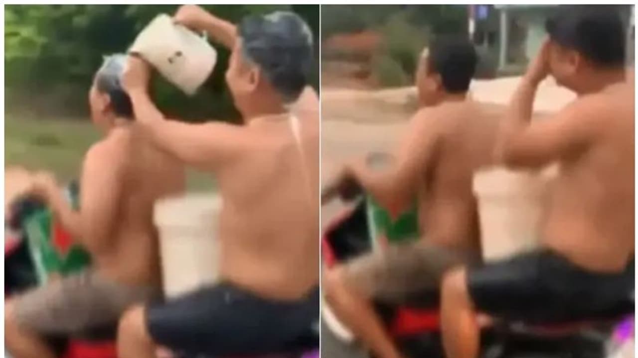 ഇരുവരും ഷർട്ടോ ഹെൽമറ്റോ ധരിക്കാതെയാണ് ബൈക്കിൽ സഞ്ചരിക്കുന്നത്. ഇരുവർക്കും നടുവിലായി ഒരു ബക്കറ്റിൽ വെള്ളം വച്ചിരിക്കുന്നു. പുറകിലിരിക്കുന്ന വ്യക്തി കപ്പ് ഉപയോഗിച്ച് വെള്ളം കോരി സ്വന്തം തലയിലും മുൻപിലിരിക്കുന്ന ആളുടെ തലയിലും ഒഴിച്ചു കൊടുക്കുന്നതായി വീഡിയോയിൽ കാണാം. ഒരു കൈ കൊണ്ട് ഡ്രൈവ് ചെയ്ത് മറുകൈ കൊണ്ടാണ് ഒരാൾ തല കഴുകുന്നത്. വീഡിയോ കണ്ടവരെല്ലാം വൻ വിമർശനമാണ് ഉന്നയിക്കുന്നത്. തിരക്കേറിയ റോഡിലെ ഈ അഭ്യാസം വളരെയധികം അപകടകരമാണെന്നാണ് എല്ലാവരുടെയും അഭിപ്രായം.