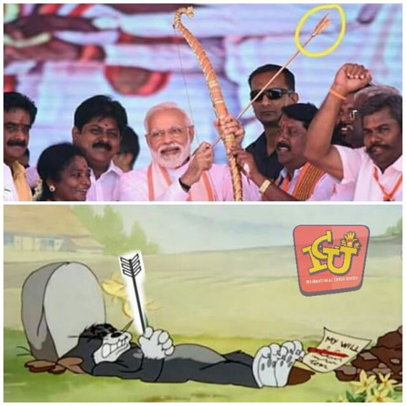 തമിഴ്നാട്ടില് തെരഞ്ഞെടുപ്പ് പ്രചരണത്തിനെത്തിയ പ്രധാനമന്ത്രി നരേന്ദ്രമോദിയുടെ ഒരു ചിത്രം സോഷ്യല് മീഡിയയില് വൈറലായിരിക്കുകയാണ്. പ്രധാനമന്ത്രി അമ്പും വില്ലുമായി നില്ക്കുന്ന ചിത്രമാണ് വൈറലായിരിക്കുന്നത്. ഇതിലെന്താ ഇത്രവലിയ കാര്യമെന്നല്ലേ. ആവേശത്തിനിടയില് അമ്പ് തലതിരിച്ച് പിടിച്ചാണ് മോദി ഫോട്ടോയ്ക്ക് പോസ് ചെയ്തിരിക്കുന്നത്. പോരേ പൂരം, ട്രോളന്മാര് ആഘോഷം തുടങ്ങിക്കഴിഞ്ഞു.