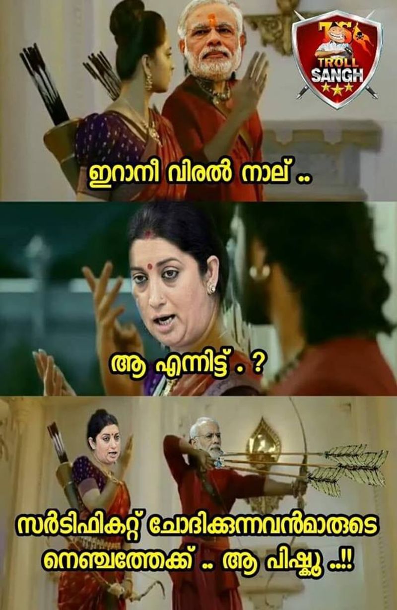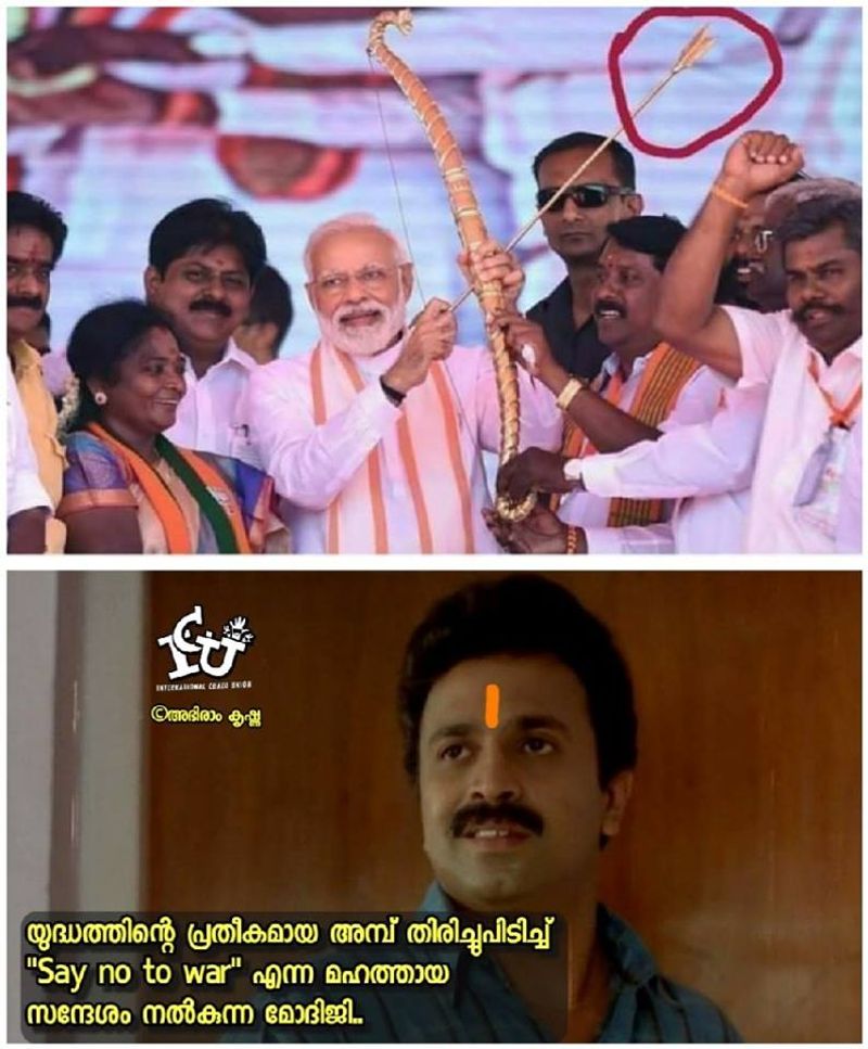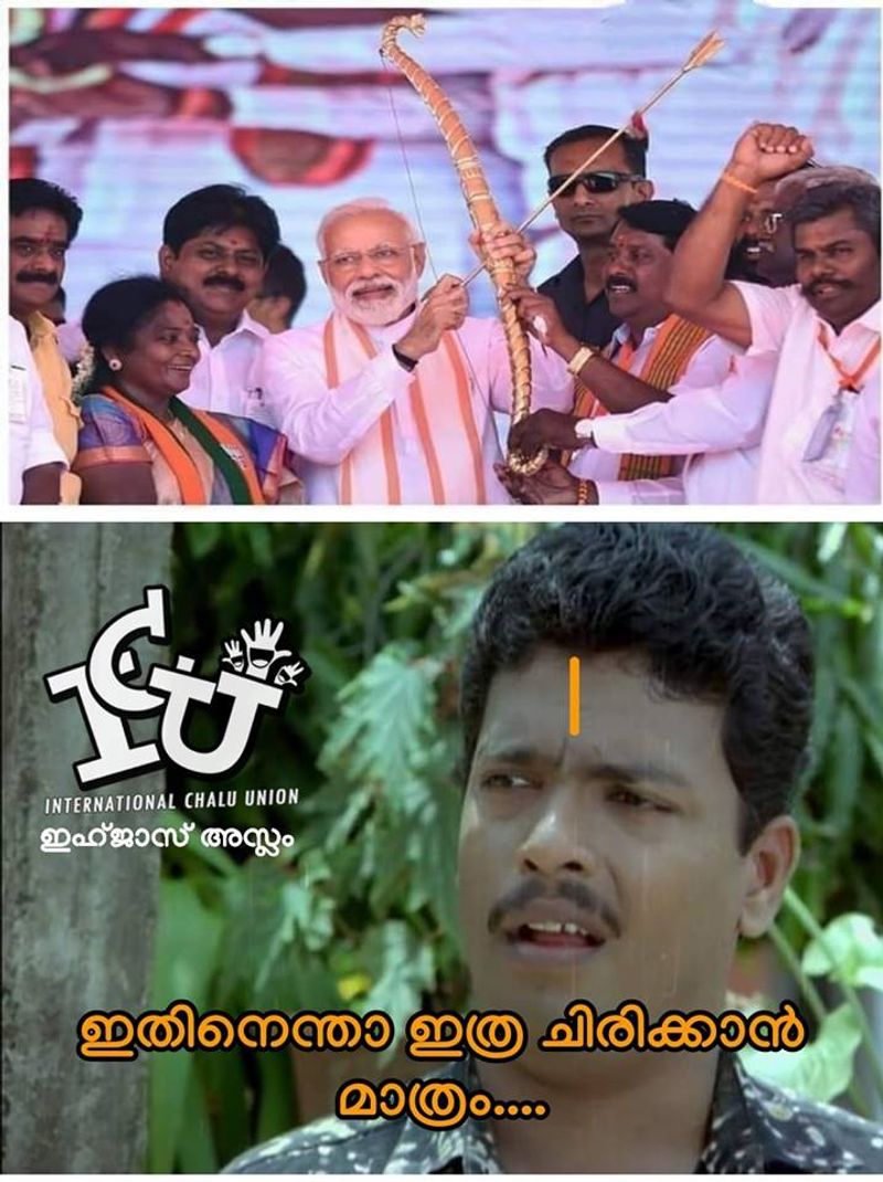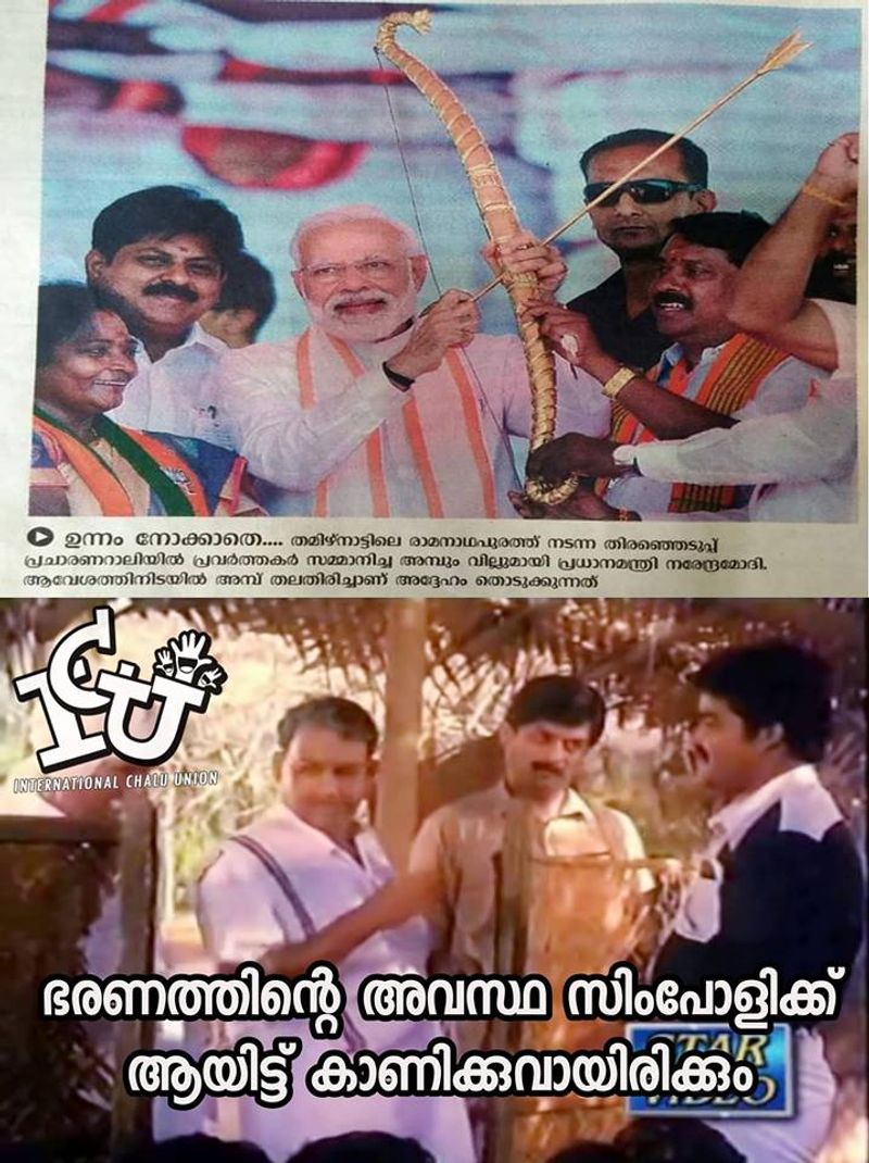 അമ്പ് തലതിരിച്ച് പിടിച്ചതിലൂടെ ഭരണത്തിന്റെ അവസ്ഥ സിമ്പോളിക്കായി കാണിച്ചതായിരിക്കുമെന്നാണ് ഒരു രസികന് ട്രോളിയിരിക്കുന്നത്. രാഹുലിന്റെ ദേഹത്ത് ലേസർ രശ്മി വന്നപ്പോലെ വന്നതാകും ഈ അമ്പും, എന്നാലും പിടിച്ചെടുത്തല്ലോ എന്നാണ് മറ്റൊരു ട്രോള്. യുദ്ധത്തിന്റെ പ്രതീകമായ അമ്പ് തിരിച്ച് പിടിച്ച് മഹത്തായ സന്ദേശം നല്കുകയാണ് മോദിജിയെന്നാണ് മറ്റൊരു രസരമായ ട്രോള്.