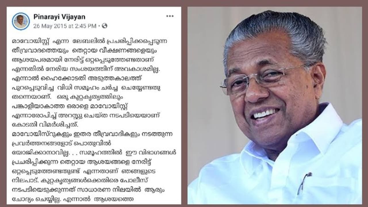 കോഴിക്കോട്: കോഴിക്കോട് മാവോയിസ്റ്റ് ബന്ധം ആരോപിച്ച് അറസ്റ്റ് ചെയ്ത രണ്ടു വിദ്യാർഥികൾക്കെതിരേ യുഎപിഎ നിയമം ചുമത്തിയ സംഭവത്തിൽ, പിണറായി വിജയന്റെ മുൻ നിലപാട് ചർച്ചയാകുന്നു. എൽഡിഎഫ് പ്രതിപക്ഷത്തിരിക്കെ, 2015 മേയിൽ ഫേസ്ബുക്കിൽ എഴുതിയ കുറിപ്പിലാണ്, തീവ്രവാദത്തിന്റെ പേരിൽ ഒരു കുറ്റകൃത്യത്തിലും പങ്കാളിയാകാത്തവരെ അറസ്റ്റ് ചെയ്യുന്നതിനെതിരേ പിണറായി നിലപാട് പറഞ്ഞത്. ഈ കുറിപ്പ് കുത്തിപ്പൊക്കി പരിഹസിക്കുന്നയാണ് ഇപ്പോൾ സമൂഹമാധ്യമങ്ങൾ.