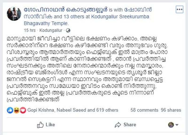 "മാന്യമായി ജീവിച്ചാ വീട്ടിലെ ഭക്ഷണം കഴിക്കാം, അല്ലെ സർക്കാരിന്റെ ഭക്ഷണം കഴിക്കേണ്ടി വരും അനുഭവം ഗുരു. വിശ്വസ്തരും ആത്മാർതതയും ഫെയ്സ്ബുക് ഇൽ മാത്രം പോരാ പ്രവർത്തിയിൽ ആണ് കാണിക്കേണ്ടത് , ഞാൻ പ്രവർത്തിച്ച സംഘടനക്കും അതിലെ നേതാക്കന്മാർക്കും നല്ല നമസ്കാരം, രാഷ്ട്രീയ ബജ്രംഗ്ദൾ എന്ന സംഘടനയുടെ തൃശൂർ ജില്ലാ ജനറൽ സെക്രട്ടറി എന്ന സ്ഥാനവും അതുമായി ബന്ധപ്പെട്ട പ്രവർത്തനവും സ്വമേധയാ ഇവിടം കൊണ്ട് നിർത്തുന്നു, ഫെയ്സ്ബുക് ഇൽ അല്ല പ്രവർത്തകരുടെ കൂടെ നിന്നാണ് പ്രവർത്തിക്കേണ്ടത്."