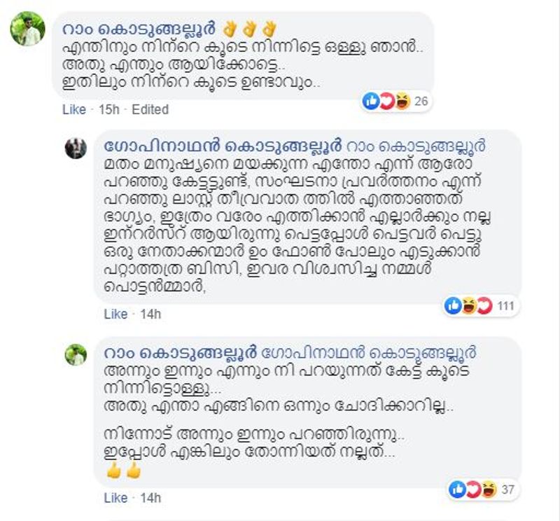 "മതം മനുഷ്യനെ മയക്കുന്ന എന്തോ എന്ന് ആരോ പറഞ്ഞു കേട്ടട്ടുണ്ട്, സംഘടനാ പ്രവർത്തനം എന്ന് പറഞ്ഞു ലാസ്റ്റ് തീവ്രവാത ത്തിൽ എത്താഞ്ഞത് ഭാഗ്യം, ഇത്രേം വരേം എത്തിക്കാൻ എല്ലാർക്കും നല്ല ഇന്റർസ്റ് ആയിരുന്നു പെട്ടപ്പോൾ പെട്ടവർ പെട്ടു ഒരു നേതാക്കന്മാർ ഉം ഫോൺ പോലും എടുക്കാൻ പറ്റാത്തത്ര ബിസി, ഇവര വിശ്വസിച്ച നമ്മൾ പൊട്ടൻമ്മാർ,"