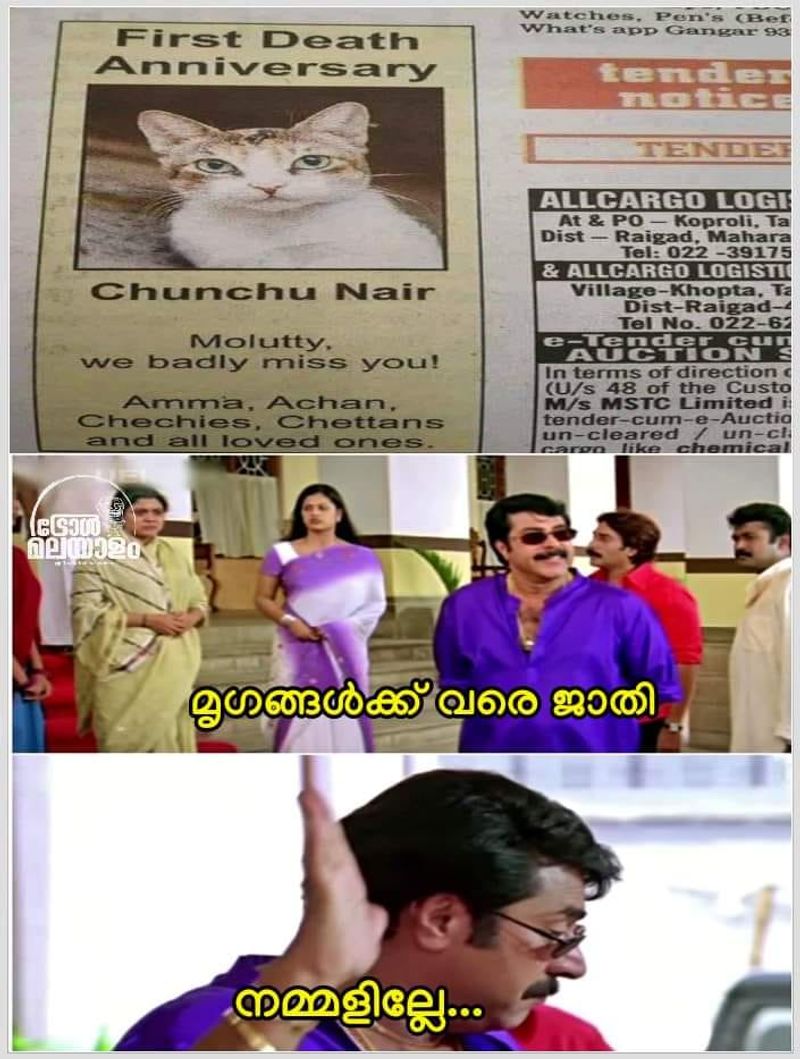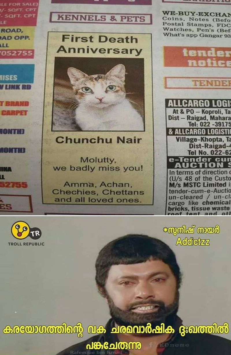 വളര്ത്തുപൂച്ച ചുഞ്ചു നായരുടെ ഒന്നാം ചരമവാര്ഷികത്തില് 'മോളൂട്ടീ വീ മിസ് യു' എന്ന് കുടുംബാഗങ്ങള് കണ്ണീരോടെ കുറിച്ച പരസ്യമാണ് ശ്രദ്ധേയമാകുന്നത്.