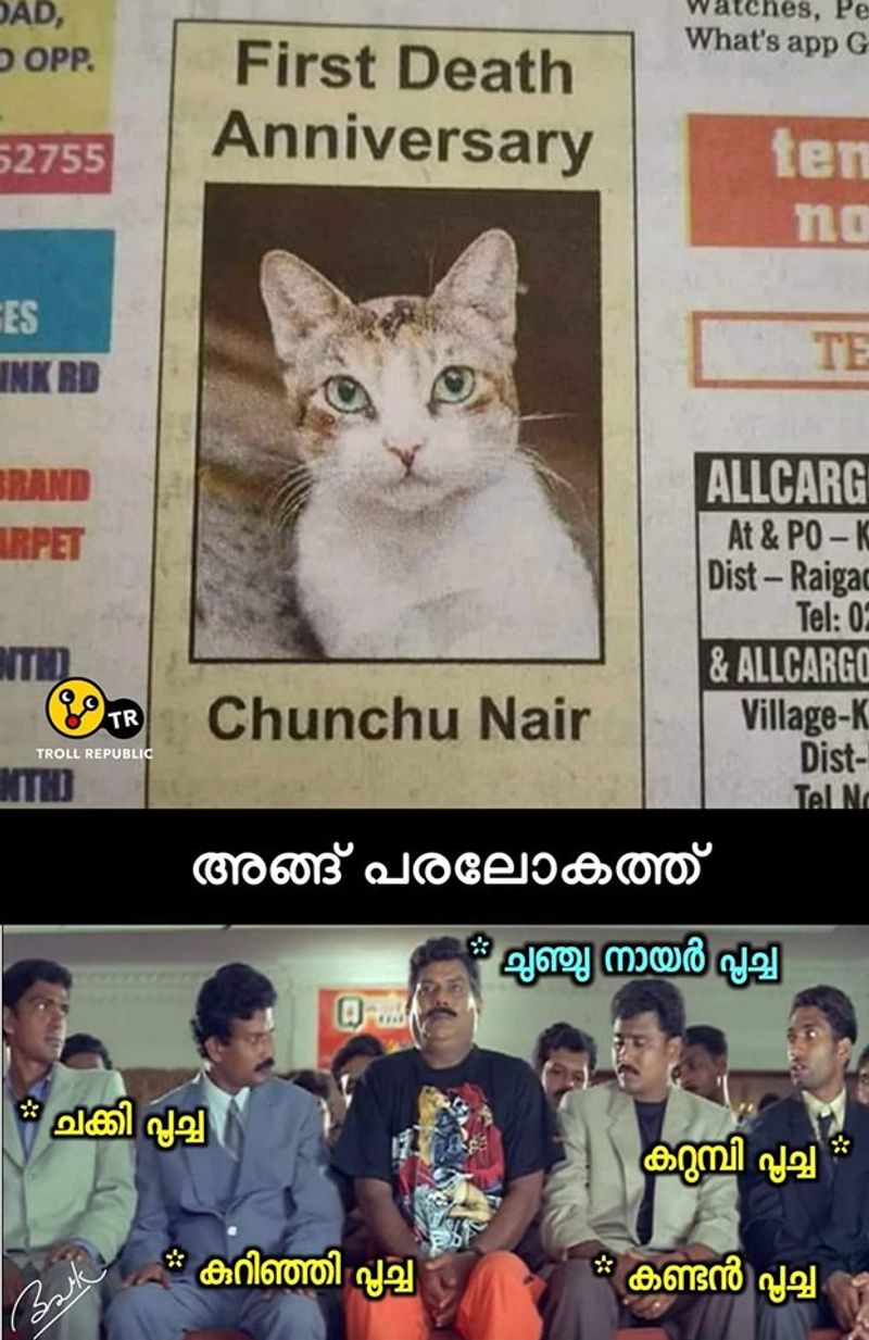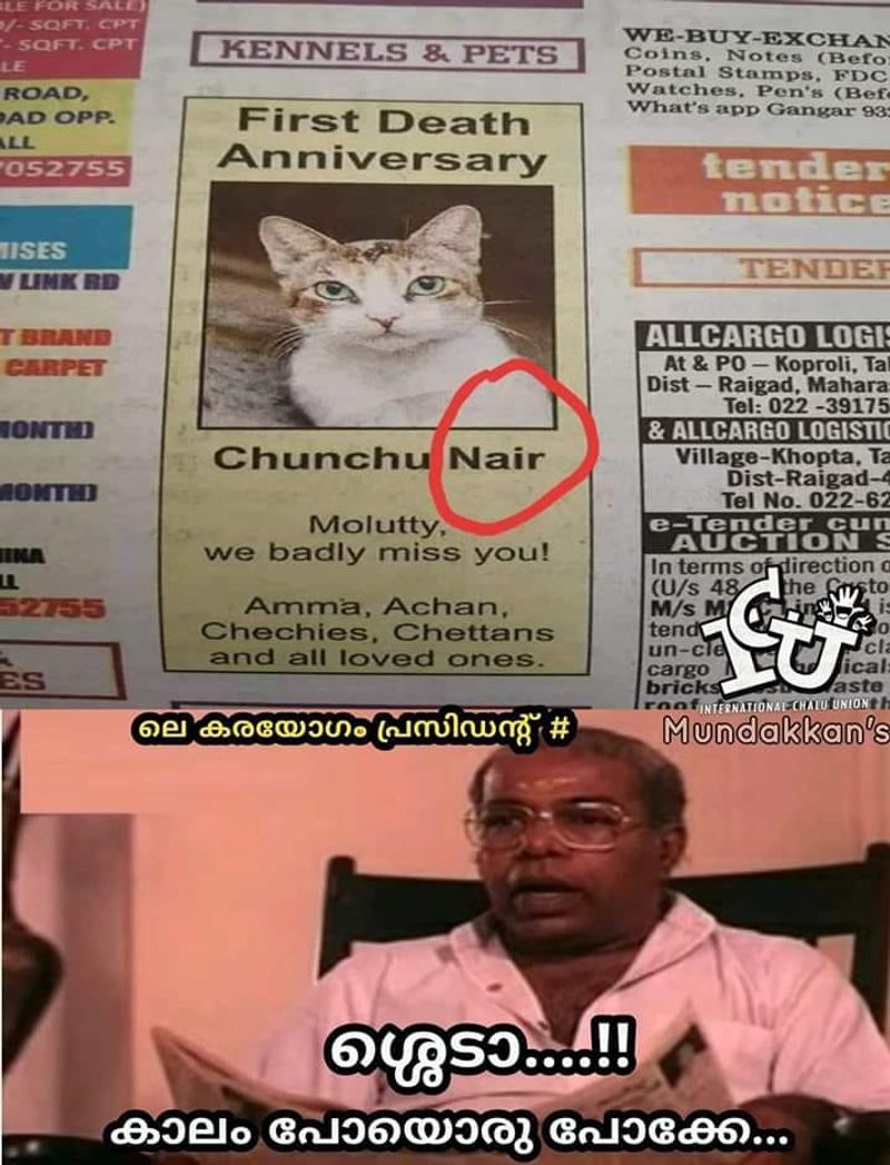 മുംബൈ: പ്രിയപ്പെട്ടവരുടെ മരണത്തില് അനുശോചനം അറിയിച്ചും ചരമ വാര്ഷികത്തില് അവരുടെ സ്മരണ പുതുക്കിയും പത്രങ്ങളില് പരസ്യം നല്കുന്നത് സാധാരണയാണ്. എന്നാല് വളര്ത്തുപൂച്ചയുടെ ചരമവാര്ഷികം കണ്ണീരോടെ ഓര്ത്തെടുത്ത വീട്ടുകാരെ ട്രോളുകയാണ് സോഷ്യല് മീഡിയ. 'ചുഞ്ചു നായര്' എന്ന പൂച്ചയുടെ പേരിലെ കൗതുകമാണ് ട്രോളന്മാര് ആഘോഷമാക്കിയിരിക്കുന്നത്.