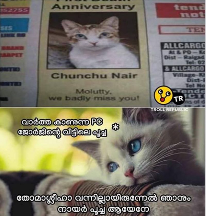 ടൈംസ് ഓഫ് ഇന്ത്യയുടെ മുംബൈ എഡിഷനില് ഇന്ന് പ്രത്യക്ഷപ്പെട്ട ഒരു പരസ്യമാണ് സാമൂഹ്യമാധ്യമങ്ങളില് ചിരിപടര്ത്തുന്ന ട്രോളുകള്ക്ക് കാരണം. വളര്ത്തുപൂച്ച ചുഞ്ചു നായരുടെ ഒന്നാം ചരമവാര്ഷികത്തില് 'മോളൂട്ടീ വീ ബാഡ്ലി മിസ് യു' എന്ന് കുടുംബാഗങ്ങള് കണ്ണീരോടെ കുറിച്ച പരസ്യമാണ് ശ്രദ്ധേയമായത്. പരസ്യം വൈറലായതോടെ നിരവധി ആളുകളാണ് സോഷ്യല് മീഡിയയില് ലൈക്കുകളും കമന്റുകളുമായി സജീവമായിരിക്കുന്നത്. പരസ്യം ഹിറ്റായതോടെ ട്രോളന്മാരും രംഗത്തെത്തി. 'ചുഞ്ചു നായര് പൂച്ച' എന്ന പേരില് ഒരു ഫേസ്ബുക്ക് അക്കൗണ്ടും ചുഞ്ചുവിന്റെ ആരാധകര് സ്യഷ്ടിച്ചു. എന്ത് തന്നെയായാലും വീട്ടുകാര് മാത്രം ഓര്ത്ത ചുഞ്ചു നായരുടെ ചരമ വാര്ഷികം ഇതോടെ തരംഗമായിരിക്കുകയാണ്.