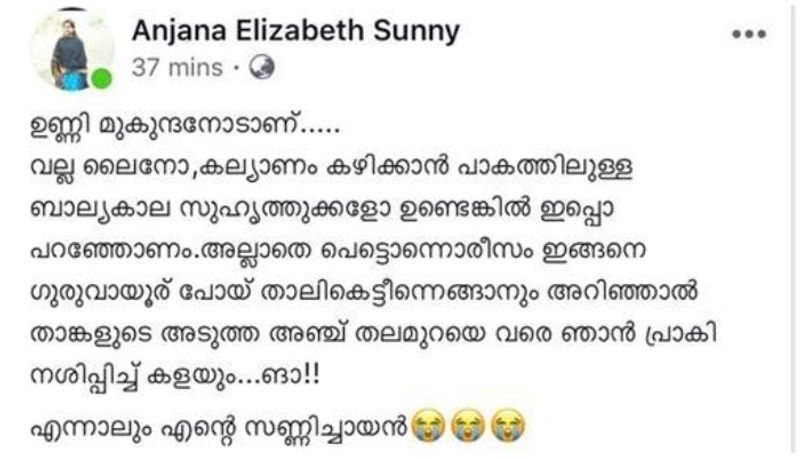 സണ്ണി വെയ്ന് വിവാഹിതനായെന്നറിഞ്ഞ് ഇതില് മനം നൊന്ത് ഒരു ആരാധികയിട്ട പോസ്റ്റിന് ഉണ്ണി മുകുന്ദന് നല്കിയ കിടിലന് മറുപടിയാണ് സാമൂഹ്യമാധ്യമങ്ങളില് ഇപ്പോള് ശ്രദ്ധേയമാകുന്നത്. 'സണ്ണി ചെയ്തതു പോലെ രഹസ്യമായെങ്ങാനും വിവാഹം കഴിച്ചാല് അഞ്ച് തലമുറയെവരെ പ്രാകിക്കൊല്ലുമെന്നായിരുന്നു ആരാധികയുടെ പോസ്റ്റ്.