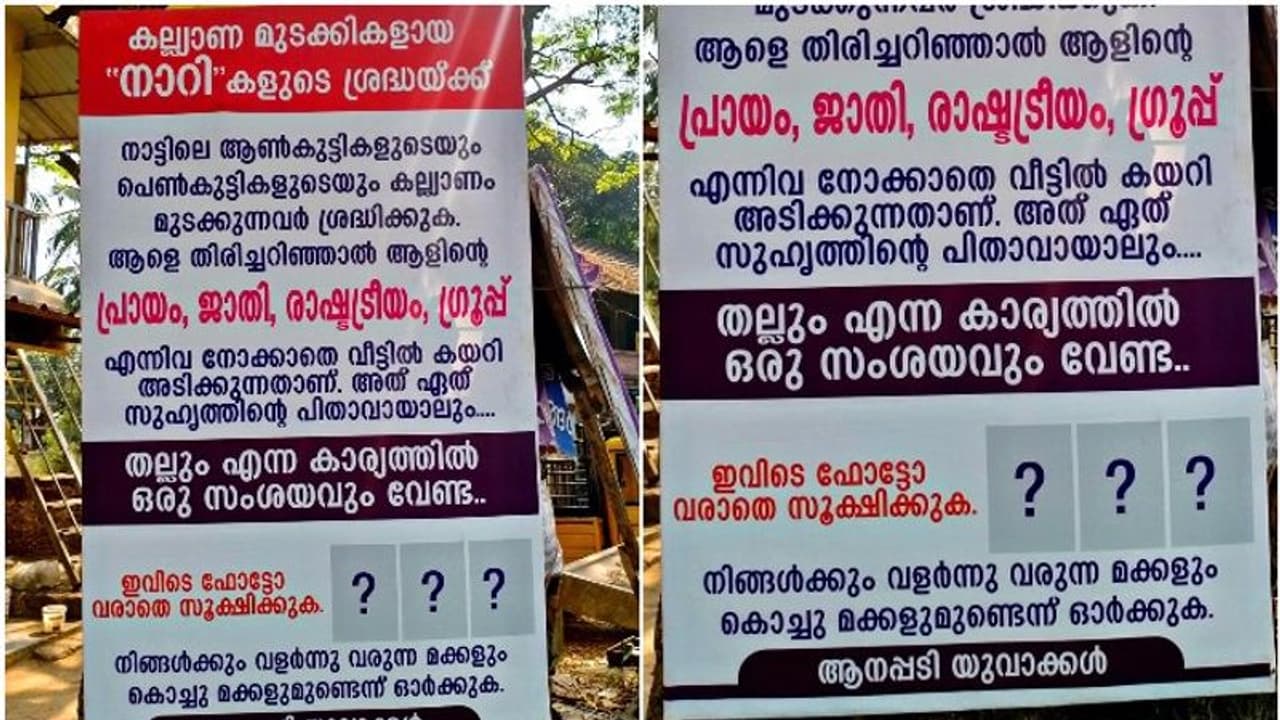 നാട്ടിലെ ആൺകുട്ടികളുടെയും പെൺകുട്ടികളുടെയും കല്യാണം മുടക്കുന്നവർ ശ്രദ്ധിക്കുക. ആളിനെ തിരിച്ചറിഞ്ഞാൽ പ്രായം, ജാതി, രാഷ്ട്രീയം, ഗ്രൂപ്പ് എന്നിവ നോക്കാതെ വീട്ടിൽ കയറി അടിക്കുന്നതാണ്. അത് ഏത് സുഹൃത്തിന്റെ പിതാവായാലും - എന്നിങ്ങനെ പോകുന്നു ഫ്ലക്സിലെ വാക്കുകൾ.