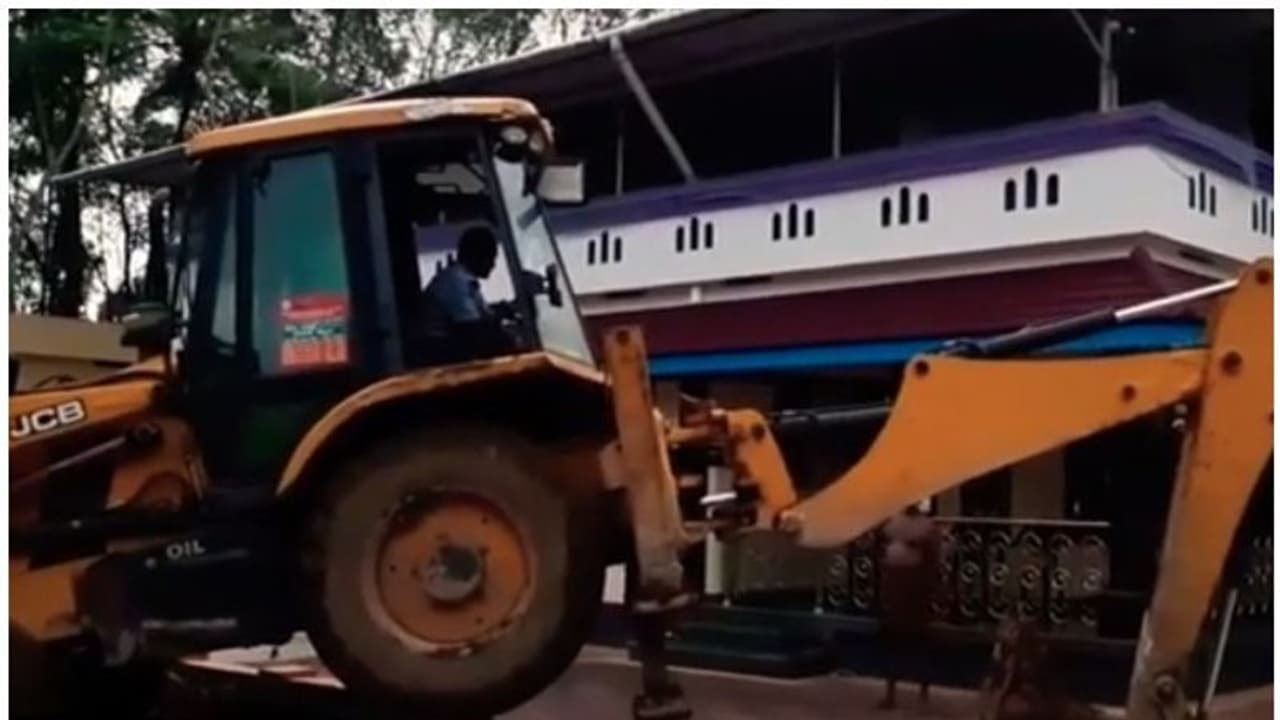 കേടുപാടുകള് കൂടാതെ വീടിന് മുമ്പിലെ ഒരു കൊച്ചുമതില് വിദഗ്ധമായി ചാടിക്കടക്കുകയാണ് ജെ സി ബി.