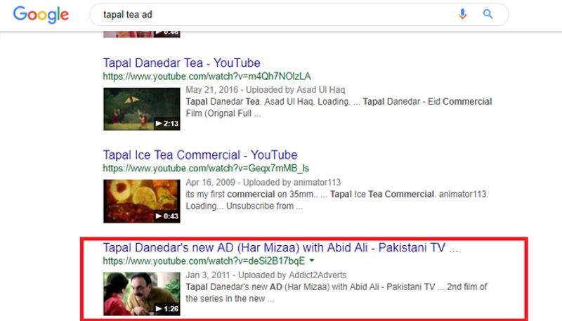 "Tapal tea ad" എന്ന് ഗൂഗിളിൽ തിരഞ്ഞ് നോക്കിയാൽ താപൽ ടീയുടെ പുറത്തിറങ്ങിയ യഥാർത്ഥ പരസ്യ ചിത്രം ലഭിക്കും. ഗൂഗിള് സെര്ച്ച് റിസള്ട്ടിന്റെ ആദ്യ പേജിൽ തന്നെ യഥാര്ത്ഥ പരസ്യ ചിത്രം കിട്ടും. ഈ വീഡിയോയിൽ അഭിനന്ദന്റെ ദൃശ്യങ്ങളില്ലെന്നും ടൈംസ് ഫാക്റ്റ് ചെക്ക് ടീം വ്യക്തമാക്കി.