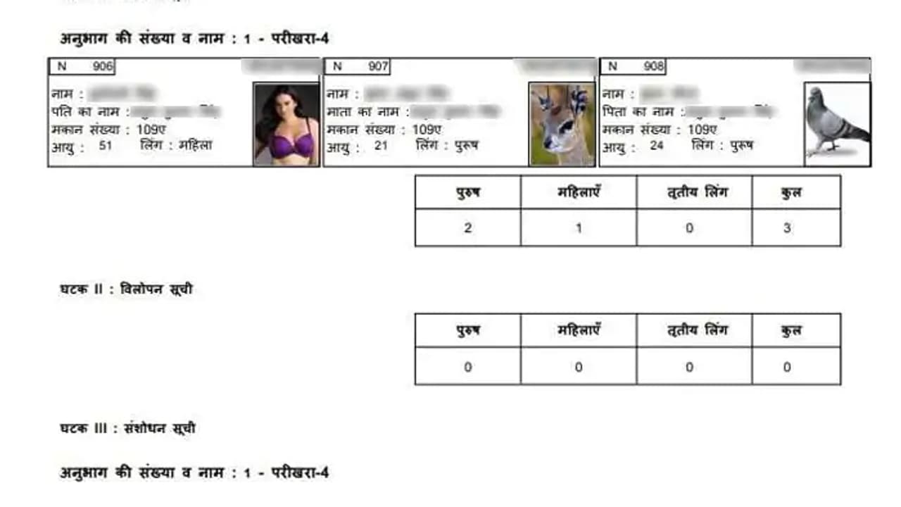 51 കാരിയുടെ പേരുവിവരങ്ങള്ക്ക് തൊട്ടടുത്താണ് സണ്ണിലിയോണിന്റെ ഫോട്ടോ നല്കിയിരിക്കുന്നത്. 56 വയസ്സുകാരന്റെ ഫോട്ടോയ്ക്ക് തൊട്ടടുത്ത് നല്കിയിരിക്കുന്നത് ആനയുടെ ഫോട്ടോ ആണ്.