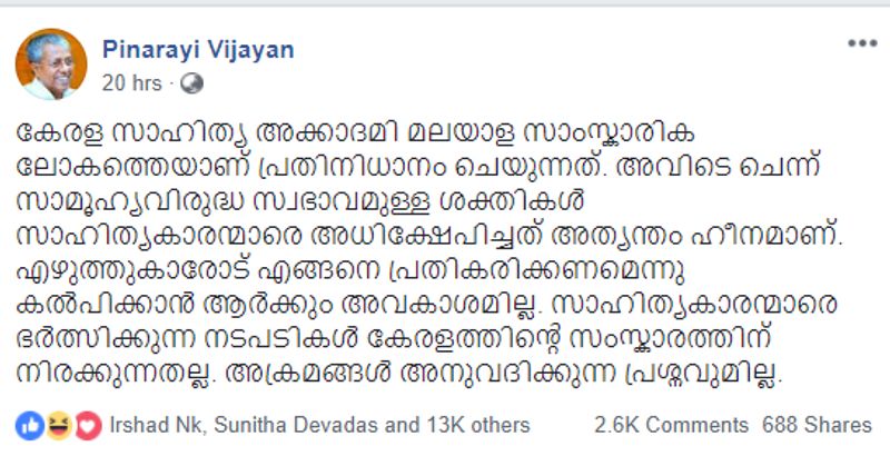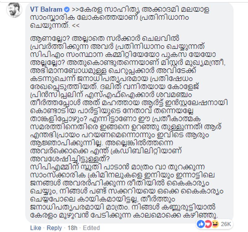 >>കേരള സാഹിത്യ അക്കാദമി മലയാള സാംസ്കാരിക ലോകത്തെയാണ് പ്രതിനിധാനം ചെയുന്നത്. << ആണല്ലോ? അല്ലാതെ സർക്കാർ ചെലവിൽ പ്രവർത്തിക്കുന്ന അവർ പ്രതിനിധാനം ചെയ്യുന്നത് സിപിഎം സംസ്ഥാന കമ്മിറ്റിയേയോ പുകസ യേയോ അല്ലല്ലോ? അതുകൊണ്ടുതന്നെയാണ് മിസ്റ്റർ മുഖ്യമന്ത്രീ, അഭിമാനബോധമുള്ള ചെറുപ്പക്കാർ അവിടേക്ക് കടന്നുചെന്ന് ജനാധിപത്യപരമായ പ്രതിഷേധം രേഖപ്പെടുത്തിയത്. ദലിത് വനിതയായ കോളേജ് പ്രിൻസിപ്പലിന് എസ്എഫ്ഐക്കാർ ശവമഞ്ചം തീർത്തപ്പോൾ അത് മഹത്തായ ആർട്ട് ഇൻസ്റ്റലേഷനായി കൊണ്ടാടിയ പാർട്ടിയുടെ നേതാവ് തന്നെയല്ലേ താങ്കളിപ്പോഴും? എന്നിട്ടാണോ ഈ പ്രതീകാത്മക സമരത്തിനെതിരെ ഇങ്ങനെ ഉറഞ്ഞു തുള്ളുന്നത്! ആര് എന്തഭിപ്രായം പറയണമെന്നൊന്നും ഇവിടെ ആരും ആജ്ഞാപിക്കുന്നില്ല. അല്ലെങ്കിൽത്തന്നെ അവർക്കൊക്കെ എന്ത് ക്രഡിബിലിറ്റിയാണ് അവശേഷിച്ചിട്ടുള്ളത്?