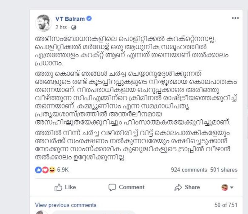 സിപിഎമ്മിന്റെ ക്രിമിനൽ രാഷ്ട്രീയത്തെക്കുറിച്ച് പറയാൻ തന്നെയാണ് ഉദ്ദേശിക്കുന്നതെന്നും അവരെ രക്ഷിച്ചെടുക്കാൻ നോക്കുന്ന 'സാംസ്കാരിക കുബുദ്ധി'കളുടെ കെണിയിൽ വീഴാൻ ഉദ്ദേശ്യമില്ലെന്നുമാണ് വി ടി ബൽറാമിന്റെ വിശദീകരണം. അഭിസംബോധനകളിലെ രാഷ്ട്രീയ ശരിയേക്കാൾ രാഷ്ട്രീയ കൊലപാതകങ്ങൾ ശരിയാണോ എന്നതാണ് പ്രധാനമെന്നും വി ടി ബൽറാം ഫേസ്ബുക്കിൽ എഴുതി.