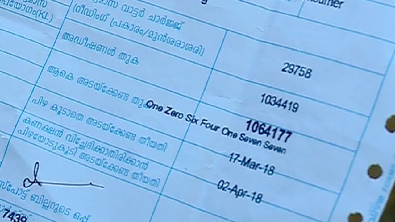 അഞ്ചുവർഷം മുന്പാണ് പീരുമേട് താലൂക്കിലെ റോസാപ്പൂക്കണ്ടം സ്വദേശിയായ രത്നമ്മ വാട്ടർ അതോറിറ്റിയുടെ കണക്ഷന് എടുത്തത്. പ്രദേശത്തെ ജില്ലാ സഹകരണബാങ്കിലെ താത്കാലിക ജീവനക്കാരിയാണ് രത്നമ്മ, ഇതുവരെ വേണ്ട സമയത്തൊന്നുംതന്നെ ഈ കണക്ഷന് വഴി പ്രദേശത്തുകാർക്കൊന്നും വെള്ളം ലഭിച്ചിട്ടില്ല. ഇതിനുപുറമേയാണ് കഴിഞ്ഞ ദിവസം 10,64,157 രൂപയുടെ ബില് രത്നമ്മയ്ക്ക് ലഭിച്ചത്. കണക്ഷന് പ്രവർത്തന രഹിതമാണെന്ന് ഈ ബില്ലില്തന്നെ രേഖപ്പെടുത്തിയിട്ടുമുണ്ട്. കഴിഞ്ഞ വർഷം കുടിശ്ശികയടക്കം 1500 രൂപ രത്നമ്മ അടച്ചതാണ്.