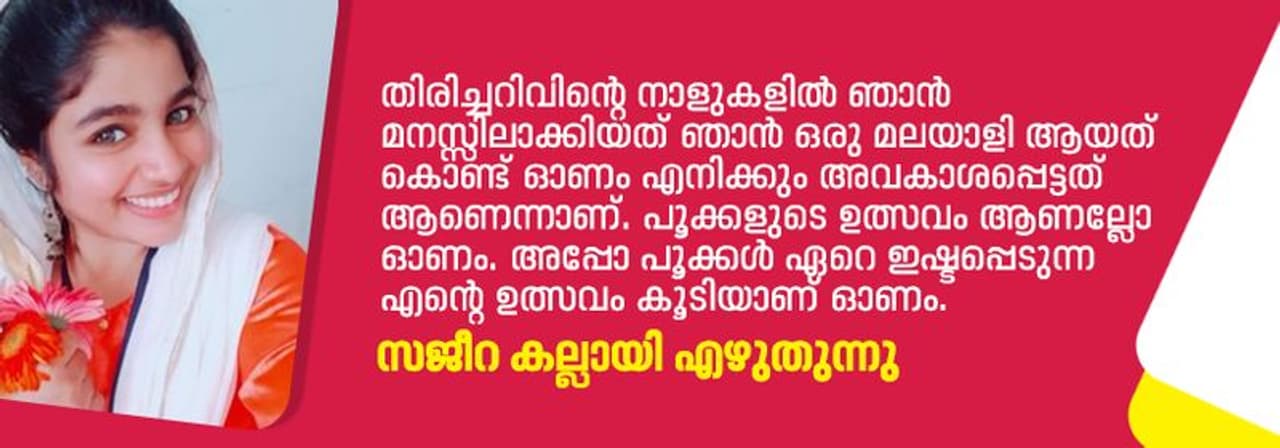 ഞാന് ഒരു കാസറഗോഡുകാരിയാണ്. ഒരു മുസ്ലിം കുടുംബത്തിലാണ് ഞാന് ജനിച്ചത്. മതാനുഷ്ഠാനത്തിന് പ്രധാന്യം കൊടുക്കുന്ന എന്റെ കുടുംബവും നാടുമാണ് എന്റെ ചുറ്റുപാട്. അതിനുള്ളില് നിന്ന് കൊണ്ട് തന്നെയാണ് ഞാന് പുറം ലോകത്തെ കാണുന്നതും അനുഭവിക്കുന്നതും. ഓണം ഹൈന്ദവരുടെ ആണെന്നും ആഘോഷങ്ങള് അവരുടേതുമാണെന്നുള്ള എന്റെ കാഴ്ചപ്പാട് മാറിയത് ഹൈസ്കൂള് കാലഘട്ടത്തിലാണ്. തിരിച്ചറിവിന്റെ നാളുകളില് ഞാന് മനസ്സിലാക്കിയത് ഞാന് ഒരു മലയാളി ആയത് കൊണ്ട് ഓണം എനിക്കും അവകാശപ്പെട്ടത് ആണെന്നാണ്. പൂക്കളുടെ ഉത്സവം ആണല്ലോ ഓണം. അപ്പോ പൂക്കള് ഏറെ ഇഷ്ടപ്പെടുന്ന എന്റെ ഉത്സവം കൂടിയാണ് ഓണം.