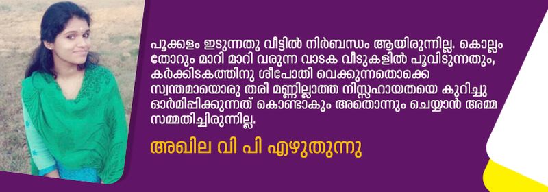 പൂക്കളം ഇടുന്നതു വീട്ടില് നിര്ബന്ധം ആയിരുന്നില്ല. കൊല്ലം തോറും മാറി മാറി വരുന്ന വാടക വീടുകളില് പൂവിടുന്നതും, കര്ക്കിടകത്തിനു ശീപോതി വെക്കുന്നതൊക്കെ സ്വന്തമായൊരു തരി മണ്ണില്ലാത്ത നിസ്സഹായതയെ കുറിച്ചു ഓര്മിപ്പിക്കുന്നത് കൊണ്ടാകും അതൊന്നും ചെയ്യാന് അമ്മ സമ്മതിച്ചിരുന്നില്ല.