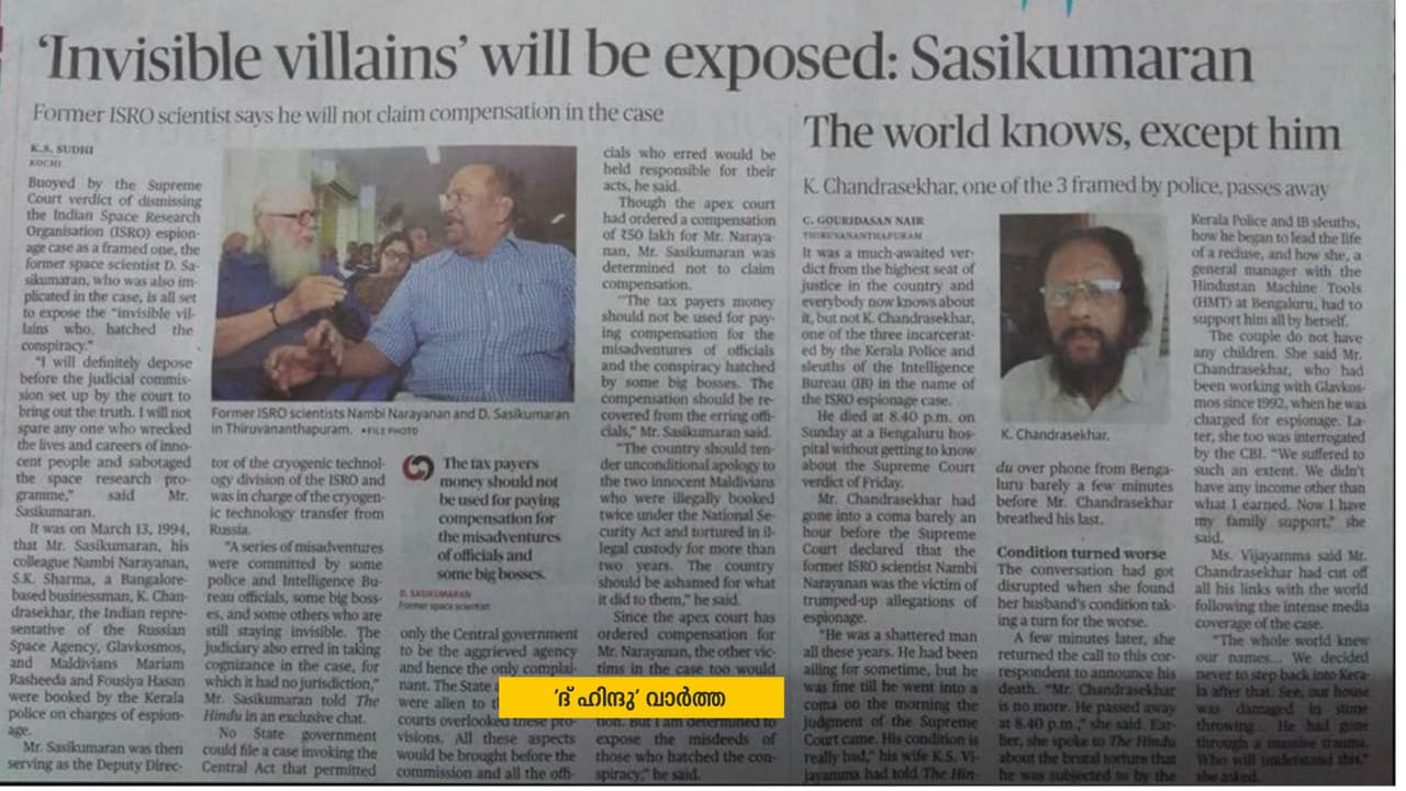 എങ്ങനെയാണ്, മറ്റൊരു മാധ്യമത്തിനും കിട്ടാത്ത ആ വാര്ത്തയിലേക്ക് എത്തിപ്പെട്ടത്? ഫിക്ഷന് പോലെ വിചിത്രമായ ചില വഴിത്തിരിവുകളിലൂടെയാണ് ആ വാര്ത്ത സംഭവിച്ചത്. ആ വാര്ത്തയ്ക്കൊപ്പം പ്രസിദ്ധീകരിച്ച, ചാരക്കേസ് പ്രതി ശശികുമാരന്റെ അഭിമുഖ സ്റ്റോറി ചെയ്ത ദ് ഹിന്ദു സീനിയര് അസി. എഡിറ്റര് കെ.എസ് സുധിയുടെ വാക്കുകളില് ആ വിസ്മയമുണ്ട്.