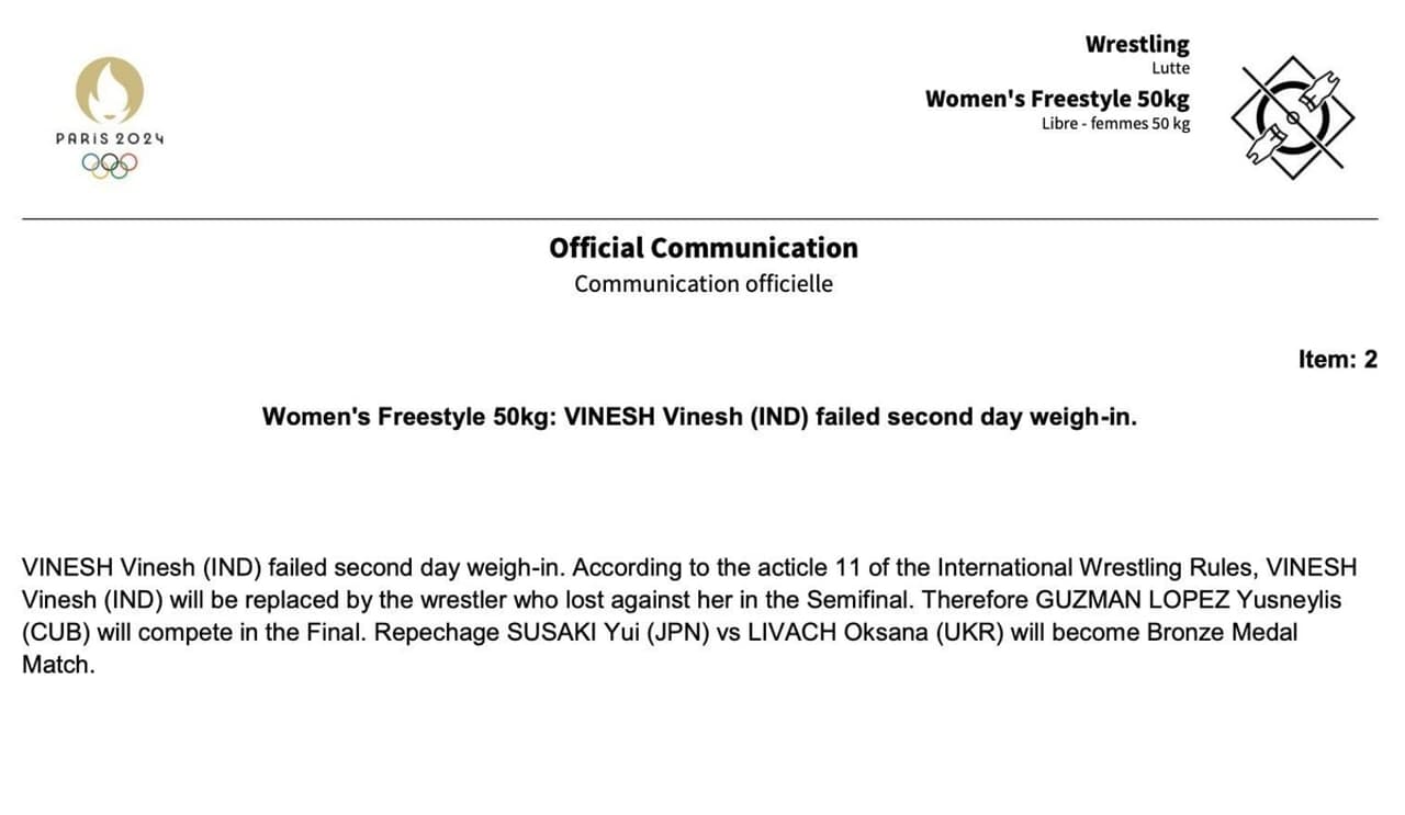ഹൃദയഭേദകം, വിനേഷിനെ ചതിച്ചത് വെറും 100 ഗ്രാം അധികഭാരം, അപ്പീല് പോലും നല്കാനാകില്ല