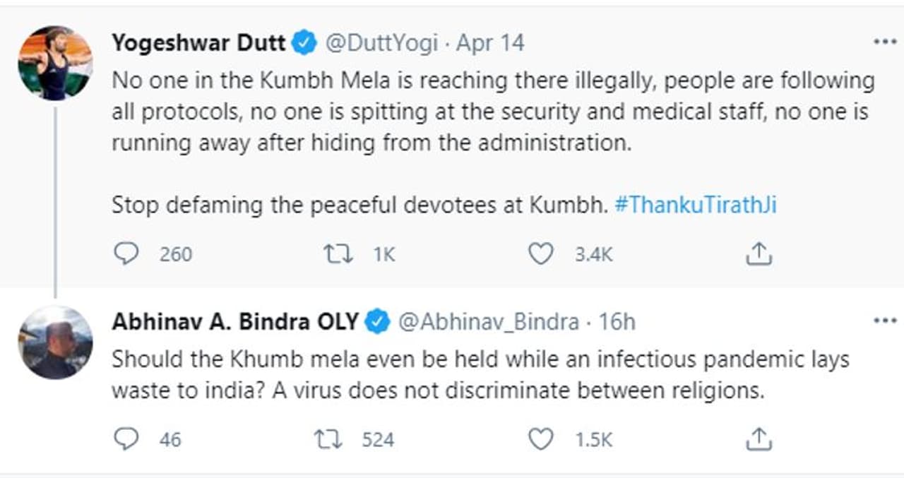 ദില്ലി: കൊവിഡ് കാലത്തെ കുംഭമേളയെക്കുറിച്ച് വാദപ്രതിവാദങ്ങൾ നടക്കുകയാണ്. പ്രധാനമന്ത്രി തന്നെ കുംഭമേള ചുരുക്കണമെന്ന് ആവശ്യപ്പെടുകയും ചെയ്തു. എന്നാൽ കുംഭമേളയുടെ പേരിൽ രണ്ട് ഇന്ത്യൻ കായിക താരങ്ങൾ കഴിഞ്ഞ ദിവസം ട്വിറ്ററിൽ ഏറ്റുമുട്ടി.