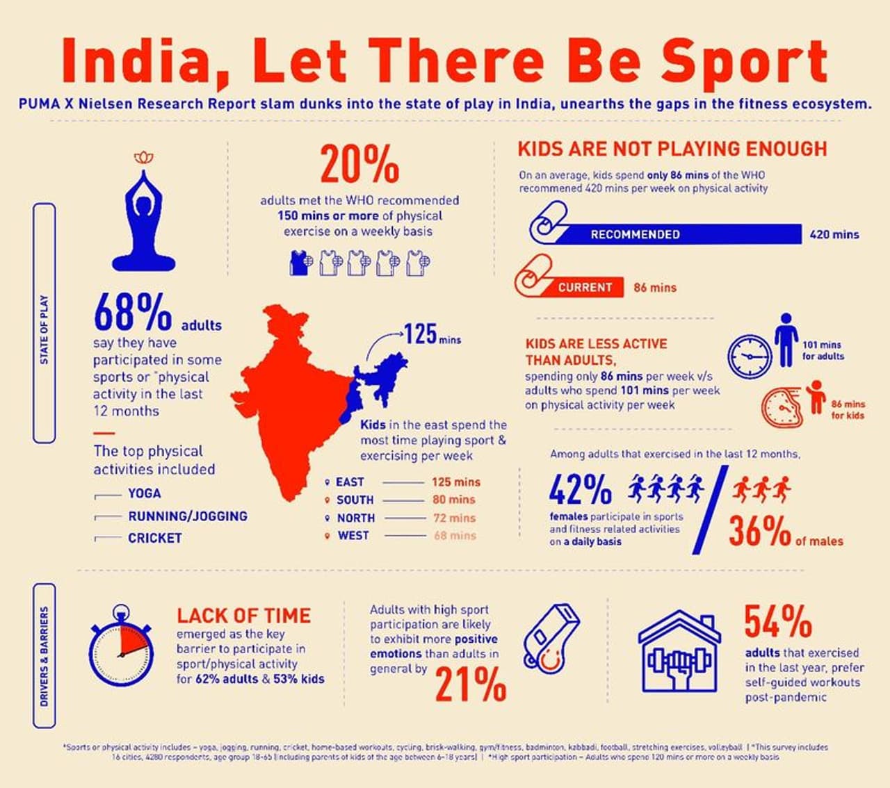 ഇന്ത്യയിലെ 16 നഗരങ്ങളിലായി 18-65 വയസ് പ്രായമുള്ള (6-18 വയസ്സിനിടയിലുള്ള കുട്ടികളുടെ രക്ഷിതാക്കൾ ഉൾപ്പെടെ) 4280 പേരെ പങ്കെടുപ്പിച്ചാണ് പ്യൂമ-നീല്സണ് സര്വെ നടത്തിയത്. പുതിയ കാമ്പെയ്നിന് കീഴിൽ, പ്യൂമ ബ്രാൻഡ് അംബാസഡർമാരായ വിരാട് കോലി, എംസി മേരി കോം, സുനിൽ ഛേത്രി, അവനി ലേഖര, ഭഗവാനി ദേവി, മറ്റ് കായികതാരങ്ങൾ എന്നിവരെ ഉൾപ്പെടുത്തി കായികവിനോദങ്ങളുടെ പ്രാധാന്യത്തെക്കുറിച്ച് ഓര്മിപ്പിക്കുന്ന വിഡിയോയയും പ്യൂമ പുറത്തിറക്കിയിട്ടുണ്ട്.