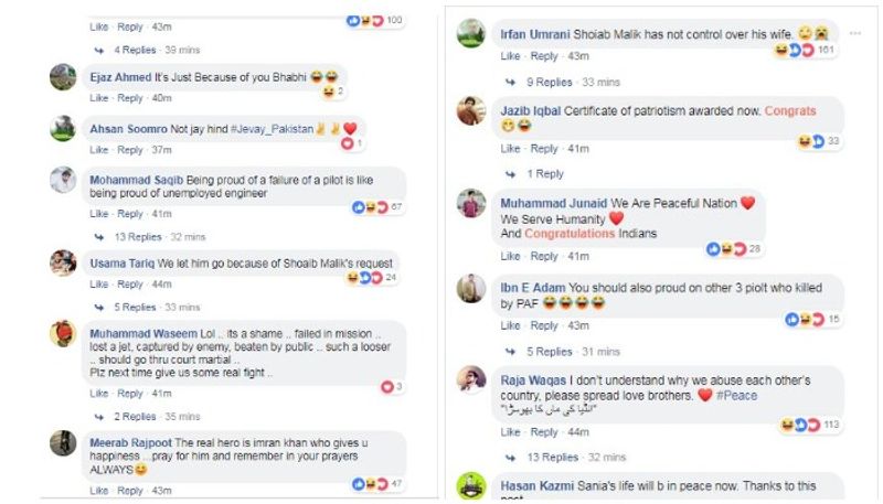 'വിങ് കമാന്റര് അഭിനന്ദന് വര്ദ്ധമാന് സ്വാഗതം. അഭിനന്ദ് ഞങ്ങളുടെ ഹീറോയാണ്. അഭിനന്ദ് കാണിച്ച ധൈര്യത്തെയും വിശ്വാസ്യതയെയും ഓര്ത്ത് രാജ്യം സല്യൂട്ട് ചെയ്യുന്നു' എന്നുമാണ് സാനിയ ഫേസ്ബുക്കില് കുറിച്ചത്. ജയ്ഹിന്ദ് എന്ന വാക്കുകളോടെയാണ് കുറിപ്പ് അവസാനിക്കുന്നത്. ഇന്ത്യന് പതാകയും സാനിയയുടെ ഫേസ്ബുക്ക് കുറിപ്പിലുണ്ടായിരുന്നു.