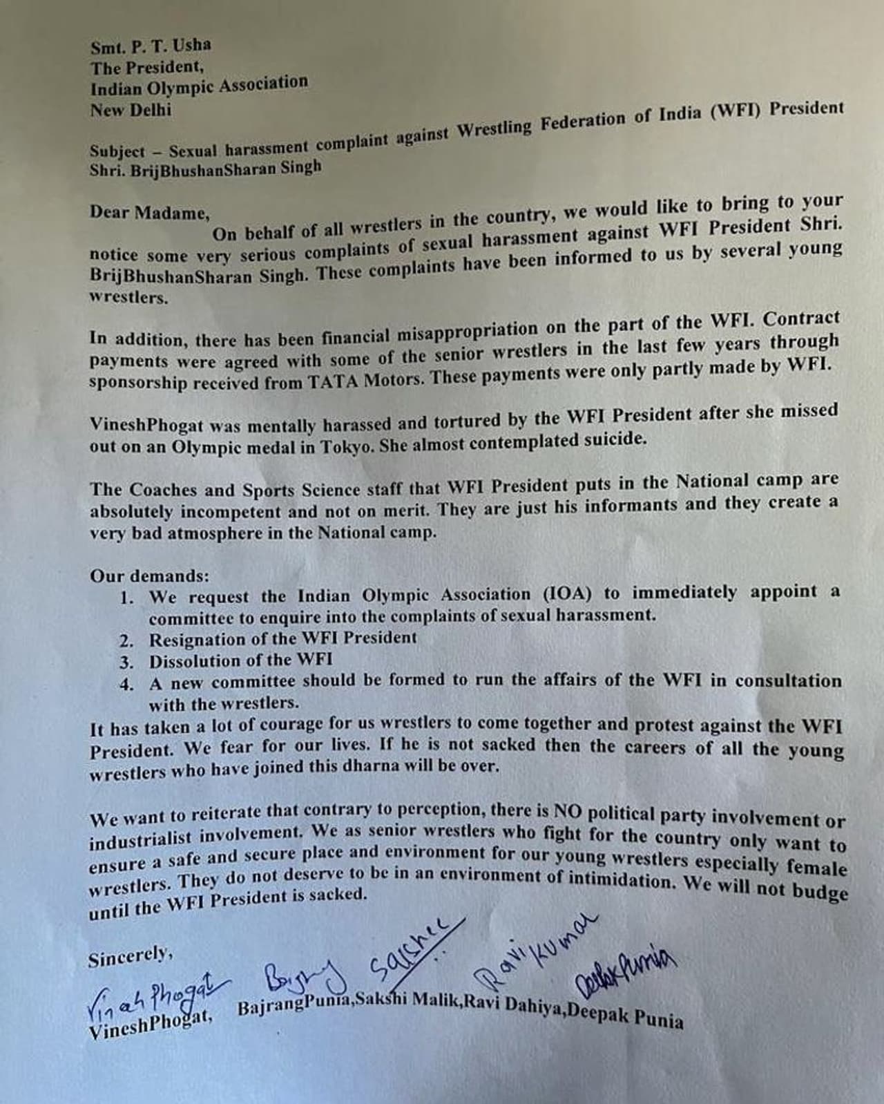 ദില്ലി: ആരോപണ വിധേയനായ ഗുസ്തി ഫെഡറേഷൻ അധ്യക്ഷൻ ബ്രിജ് ഭൂഷൺ സിങ്ങിനെതിരെ ഒളിംപിക് അസോസിയേഷൻ അധ്യക്ഷ പിടി ഉഷയ്ക്ക് പരാതി നൽകി പ്രതിഷേധിക്കുന്ന ഗുസ്തി താരങ്ങൾ. ഗുസ്തി താരങ്ങളായ വിനേഷ് ഫോഗട്, ബജ് റംഗ് പൂനിയ, സാക്ഷി മാലിക്, രവി ദഹിയ, ദീപക് പൂനിയ എന്നിവരാണ് ബ്രിജ് ഭൂഷണെതിരെ പി ടി ഉഷക്ക് പരാതി നൽകിയത് ലൈംഗിക ആരോപണം ഉൾപ്പെടെ അന്വേഷിക്കാൻ അടിയന്തരമായി സമിതി രൂപീകരിക്കണമെന്നും റെസ്ലിംഗ് സോസിയേഷൻ പ്രസിഡന്റ് സ്ഥാനം ബ്രിജ് ഭൂഷണ് ഉടന് രാജിവെയ്ക്കണമെന്നും താരങ്ങള് പരാതിയില് ആവശ്യപ്പെട്ടിട്ടുണ്ട്.