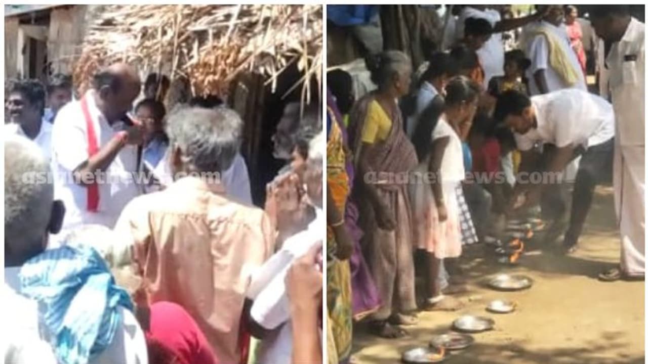 പ്രചാരണത്തിനായി എത്തുന്ന വിശ്വനാഥനെ സ്വീകരിക്കാന് കാത്തുനിന്ന സ്ത്രീകളുടെ മുന്നില്വച്ചിരുന്ന താലത്തിലേക്കാണ് പാര്ട്ടി പ്രവര്ത്തകന് നോട്ട് ഇടുന്നത്. ഒരാള്ക്ക് രണ്ടായിരം രൂപ വീതമാണ് വിതരണം ചെയ്തത്. വീടുകള് തോറുമുള്ള പ്രചാരണത്തിനിടെ സ്ഥാനാര്ത്ഥി ഷര്ട്ടിന്റെ പോക്കറ്റില് നിന്ന് പണം എടുത്ത് വീട്ടുകാര്ക്ക് നല്കി. പ്രദേശവാസികള് കഷടതകള് അറിയിച്ചപ്പോള് സഹായിച്ച് മാത്രമെന്നാണ് അണ്ണാഡിഎംകെ വിശദീകരണം.