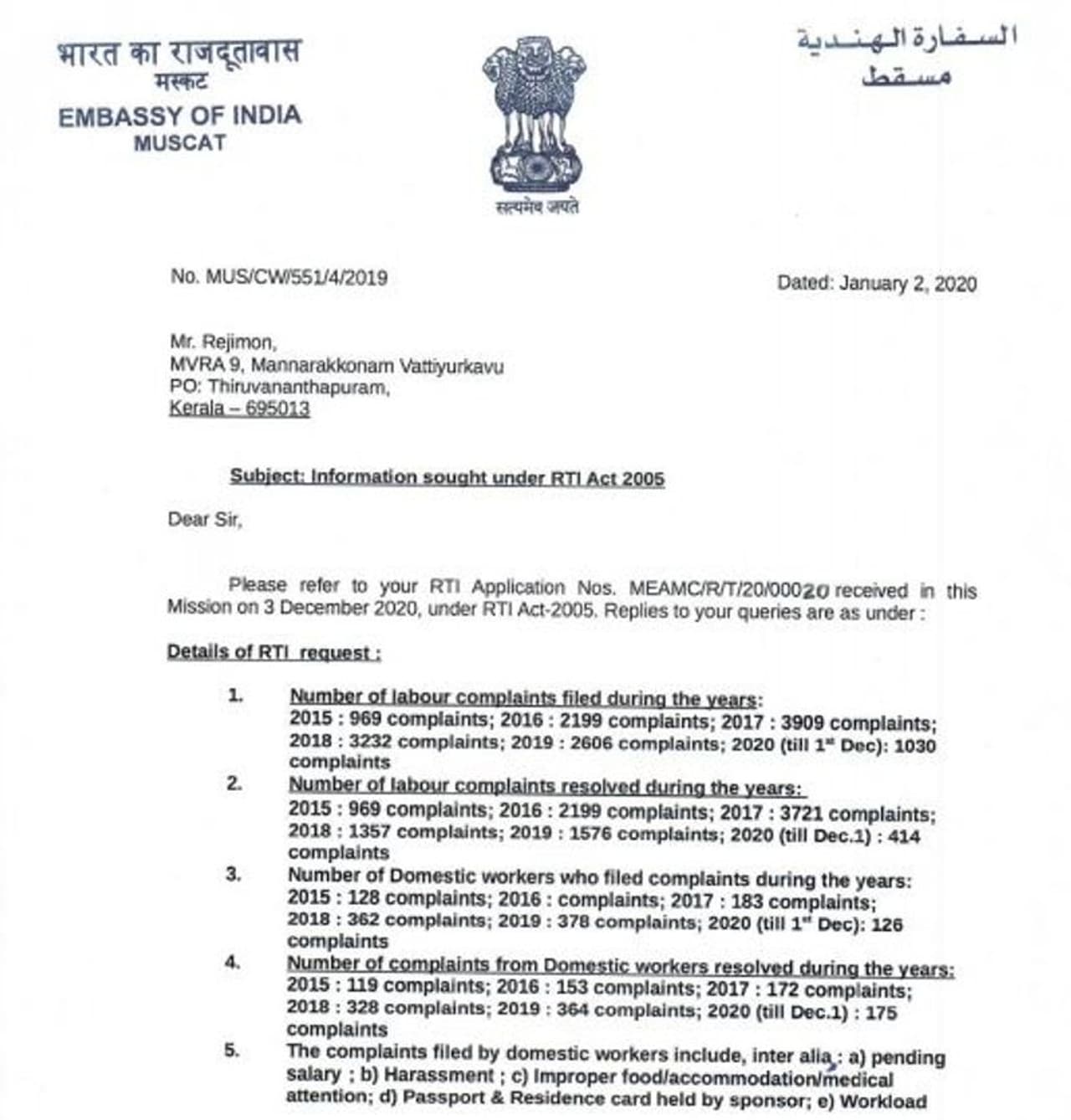 2020 തുടക്കം മുതല് ഡിസംബര് ഒന്നുവരെയുള്ള കണക്ക് പ്രകാരം 1030 തൊഴില് സംബന്ധമായ പരാതികളാണ് എംബസിയില് രജിസ്റ്റര് ചെയ്തിട്ടുള്ളത്.