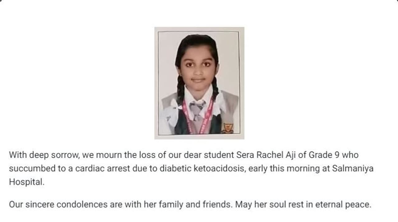 സെറയുടെ മരണത്തില് ബഹ്റൈനിലെ ഏഷ്യന് സ്കൂള് അനുശോചനം രേഖപ്പെടുത്തി. ഡയബറ്റിക് കീറ്റോഅസിഡോസിസ് മൂലം സംഭവിച്ച ഹൃദയാഘാതമായിരുന്നു കുട്ടിയുടെ മരണകാരണമായതെന്ന് സ്കൂള് വെബ്സൈറ്റില് പ്രസിദ്ധീകരിച്ച അറിയിപ്പില് പറയുന്നു. ജനിതകമായ പ്രത്യേകതകള് കാരണം കുട്ടികളില് കൗമാരപ്രായത്തിന് മുമ്പ് തന്നെ പ്രകടമായി തുടങ്ങുകയും പിന്നീട് ജീവിത കാലത്തുടനീളം നീണ്ടുനില്ക്കുന്നതുമായ പ്രമേഹ രോഗമാണ് ടൈപ്പ് - 1 പ്രമേഹം. ഇത്തരം ആളുകളില് സംഭവിക്കാന് സംഭവിക്കാന് സാധ്യതയുള്ളതും ജീവന് തന്നെ അപകടത്തിലാക്കുന്നതുമായ രോഗാവസ്ഥയാണ് ഡയബറ്റിക് കീറ്റോഅസിഡോസ് എന്ന് ആരോഗ്യ വിദഗ്ധര് പറയുന്നു.
