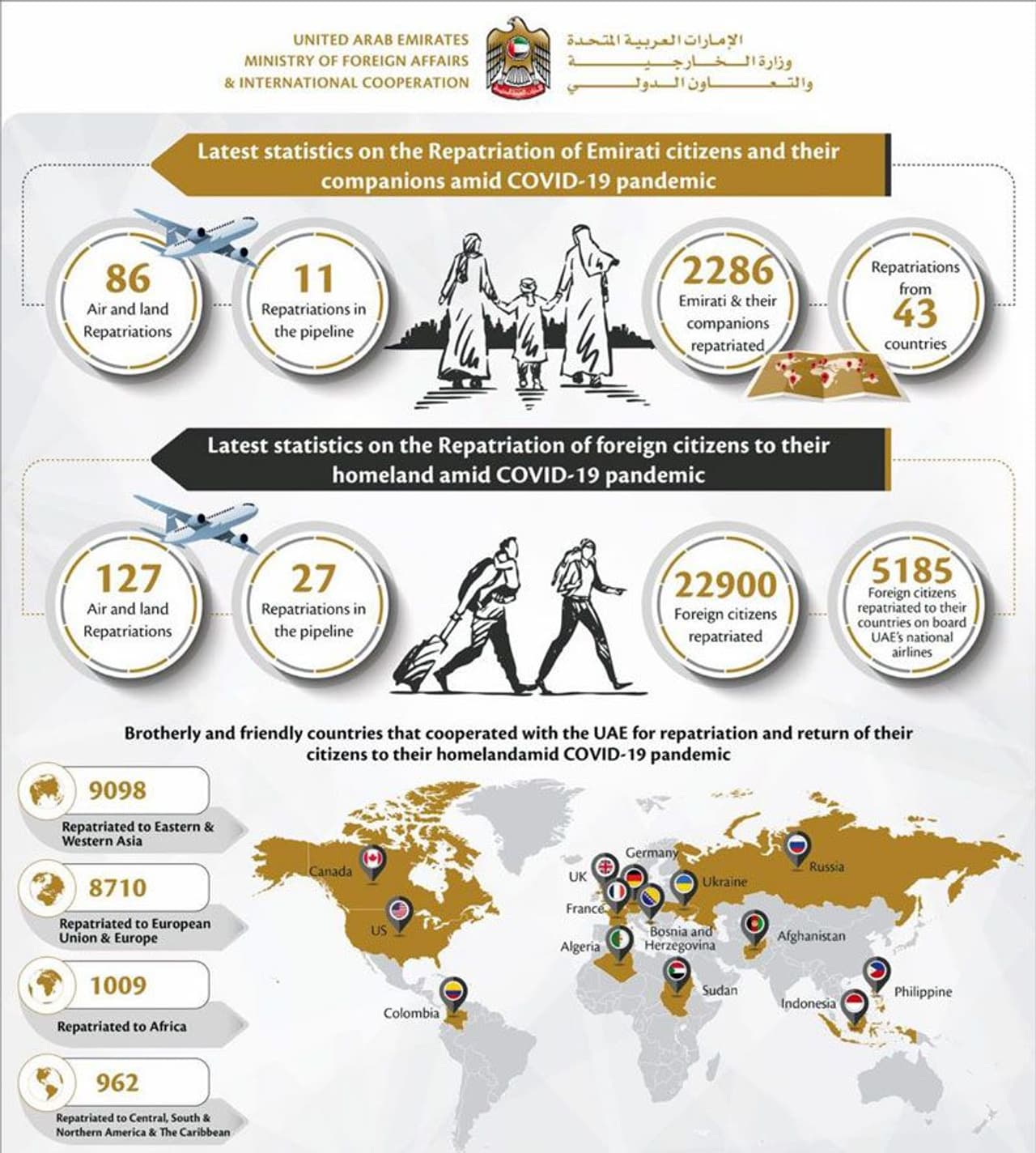 അതേസമയം 2286 യുഎഇ പൗരന്മാരെയും അവര്ക്കൊപ്പമുണ്ടായിരുന്നവരെയും ഇതിനോടകം സര്ക്കാര് തിരിച്ചെത്തിച്ചിട്ടുണ്ട്. 43 രാജ്യങ്ങളില് കുടുങ്ങിയ യുഎഇ പൗരന്മാരെ ഇങ്ങനെ തിരിച്ചെത്തിച്ചു. ഇനിയും ചില രാജ്യങ്ങളില് നിന്നുകൂടി തങ്ങളെ പൗരന്മാരെ തിരിച്ചെത്തിക്കാനുള്ള നടപടികള് പുരോഗമിക്കുകയാണെന്നും വിദേശകാര്യ-അന്താരാഷ്ട്ര സഹകരണ മന്ത്രാലയം അറിയിച്ചു.