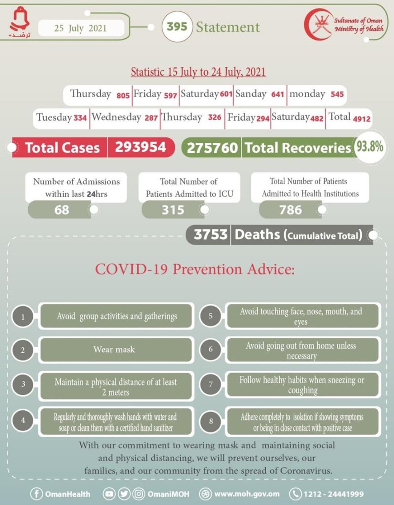 വലിയ പെരുന്നാള് അവധി പ്രമാണിച്ച് അവധി ആയിരുന്നതിനാല് കഴിഞ്ഞ പത്ത് ദിവസത്തെ കൊവിഡുമായി ബന്ധപ്പെട്ട കണക്കുകള് ഇന്നാണ് ഒമാന് ആരോഗ്യ മന്ത്രാലയം മന്ത്രാലയം പുറത്ത് വിട്ടത്. ഇതുവരെ റിപ്പോര്ട്ട് ചെയ്യപ്പെട്ട കൊവിഡ് കേസുകളുടെ എണ്ണം 293954 ആയി. ഇവരില് 275760 പേരാണ് രോഗമുക്തരായത്. ഇപ്പോള് 93.8 % ശതമാനമാണ് രോഗമുക്തി നിരക്ക്. 3753 പേര്ക്കാണ് കൊവിഡ് കാരണം ഒമാനില് ജീവന് നഷ്ടമായത്. കഴിഞ്ഞ 24 മണിക്കൂറിനിടെ മാത്രം 68 കൊവിഡ് രോഗികളെ രാജ്യത്തെ വിവിധ ആശുപത്രികളില് പ്രവേശിപ്പിച്ചു. ഇവര് ഉള്പ്പെടെ 786 പേര് ഇപ്പോള് ആശുപത്രികളില് ചികിത്സയില് കഴിയുന്നുണ്ട്. ഇവരില് 315 പേര് തീവ്രപരിചരണ വിഭാഗങ്ങളിലാണ്.