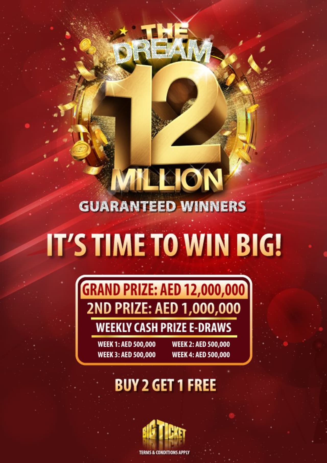 ഫെബ്രുവരിയില് ബിഗ് ടിക്കറ്റെടുക്കുന്നവരെ ഉള്പ്പെടുത്തി മാര്ച്ച് മൂന്നിന് നടക്കാനിരിക്കുന്ന ഡ്രീം 12 മില്യന് നറുക്കെടുപ്പില് 24 കോടിയാണ് (1.2 കോടി ദിര്ഹം) ഒന്നാം സമ്മാനം. 10 ലക്ഷം ദിര്ഹത്തിന്റെ രണ്ടാം സമ്മാനത്തിന് പുറമെ വന്തുകകളുടെ മറ്റ് അഞ്ച് ക്യാഷ് പ്രൈസുകള് കൂടി അന്ന് വിജയികളെ കാത്തിരിക്കുകയാണ്.
