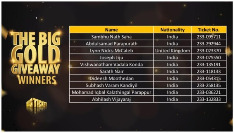 ഒക്ടോബര് 22 മുതല് 29 വരെയുള്ള കാലയളവില് ബിഗ് ടിക്കറ്റിന്റെ ബൈ ടു ഗെറ്റ് വണ് ഫ്രീ ഓഫറിലൂടെ ടിക്കറ്റുകളെടുത്തവരെയാണ് ബിഗ് ഗോള്ഡ് ഗിവ് എവേ നറുക്കെടുപ്പില് ഉള്പ്പെടുത്തിയത്. ഇലക്ട്രോണിക് നറുക്കെടുപ്പ് വഴി 10 ഭാഗ്യശാലികളെയാണ് ബിഗ് ടിക്കറ്റ് അധികൃതര് തെരഞ്ഞെടുത്തത്. ഇവര്ക്ക് ഓരോരുത്തര്ക്കും 100 ഗ്രാം വീതം 24 കാരറ്റ് സ്വര്ണം സമ്മാനമായി ലഭിച്ചു.
