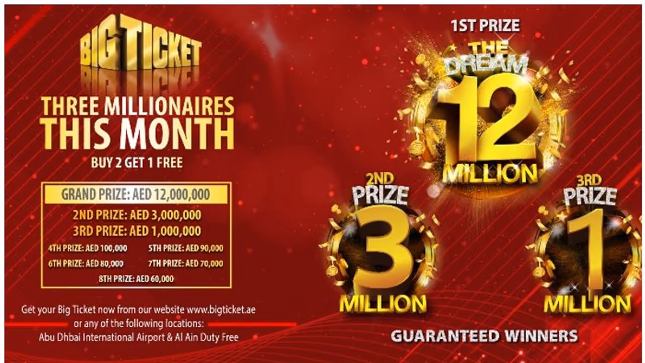 ബിഗ് ടിക്കറ്റ് ഡ്രീം 12 മില്യന് സീരിസിലെ അടുത്ത നറുക്കെടുപ്പില് 1.2 കോടി ദിര്ഹമാണ്(24 കോടിയോളം ഇന്ത്യന് രൂപ) ഗ്രാന്റ് പ്രൈസ്. രണ്ടാം സമ്മാനമായി മുപ്പത് ലക്ഷം ദിര്ഹവും(5 കോടിയിലധികം ഇന്ത്യന് രൂപ) ഇതിന് പുറമെ മൂന്നാം സമ്മാന വിജയികളെ കാത്തിരിക്കുന്നത് 10 ലക്ഷം ദിര്ഹവുമാണ്.