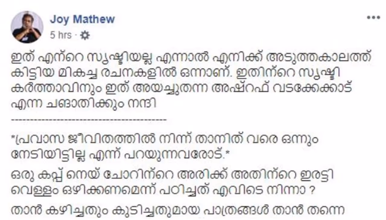 പ്രവാസം ഒരാളുടെ ജീവിതത്തിലുണ്ടാക്കുന്ന മാറ്റങ്ങളുടെയും പാഠങ്ങളുടെയും കുറിപ്പ് പങ്കുവെച്ച് നടന് ജോയ് മാത്യു. പ്രവാസ ജീവിതത്തിൽ നിന്ന് താനിത് വരെ ഒന്നും നേടിയിട്ടില്ല എന്ന് പറയുന്നവര്ക്കാണ് ജോയ് മാത്യു കുറിപ്പ് സമര്പ്പിക്കുന്നത്. ഒട്ടേറെ മൂല്യങ്ങളും നല്ല ശീലങ്ങളും നമ്മുടെ ജീവിതത്തിലേക്ക് കൊണ്ടുവന്നത് പ്രവാസമാണെന്ന് ജോയ് മാത്യു പങ്കുവെച്ച കുറിപ്പില് പറയുന്നു. രസകരമായ കുറിപ്പ് നിരവധി പേരാണ് ഷെയര് ചെയ്തത്. അഷ്റഫ് വടക്കേക്കാട് എന്ന സുഹൃത്താണ് കുറിപ്പ് അയച്ചുകൊടുത്തതെന്നും അദ്ദേഹം പറയുന്നു.