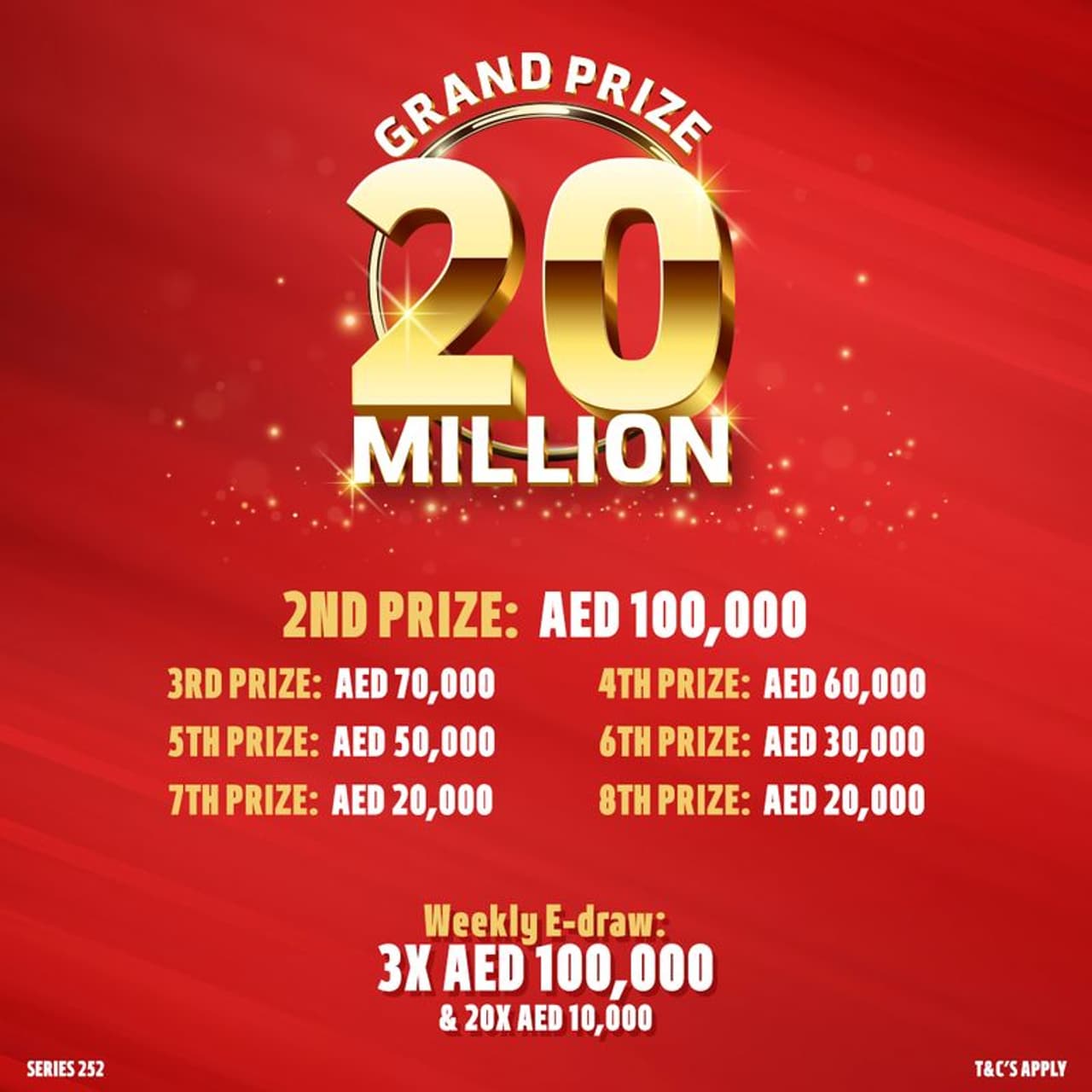 ബിഗ് ടിക്കറ്റ് വിജയിക്ക് 20 മില്യൺ ദിർഹം നേടാൻ അവസരം. ഗ്രാൻഡ് പ്രൈസ് കൂടാതെ ഗ്യാരണ്ടീഡ് ക്യാഷ് പ്രൈസുകളും നേടാം.