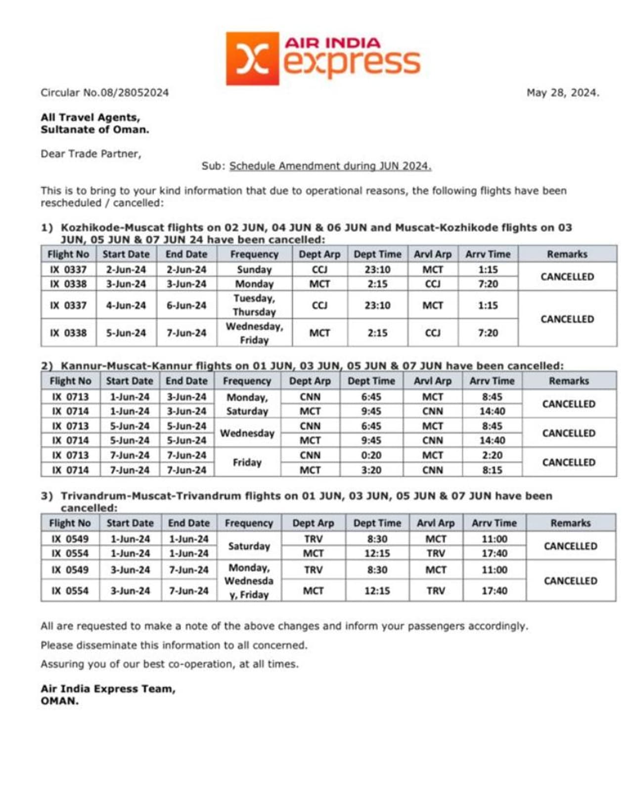 ജൂൺ 1, 3, 5, 7 ദിവസങ്ങളിൽ കണ്ണൂരിൽ നിന്നും മസ്കറ്റിലേക്കും തിരിച്ചും സർവീസുണ്ടാകില്ല. തിരുനന്തപുരത്ത് നിന്നും മസ്കറ്റിലേക്കും തിരിച്ചുമുള്ള സർവീസുകളേയും പുതിയ തീരുമാനം ബാധിക്കും. ജൂൺ 1, 3, 5, 7 ദിവസങ്ങളിൽ തിരുവനന്തപുരം- മസ്കറ്റ് സർവീസ് ഉണ്ടാകില്ലെന്നും എയർഇന്ത്യ എക്സ്പ്രസ് അറിയിച്ചു. ബലിപെരുന്നാൾ ആഘോഷത്തിനും കേരളത്തിൽ അധ്യയന വർഷം ആരംഭിക്കുന്നത് കണക്കാക്കിയും യാത്ര പ്ലാൻ ചെയ്തവർക്ക് കനത്ത തിരിച്ചടിയാകും ഇത്.