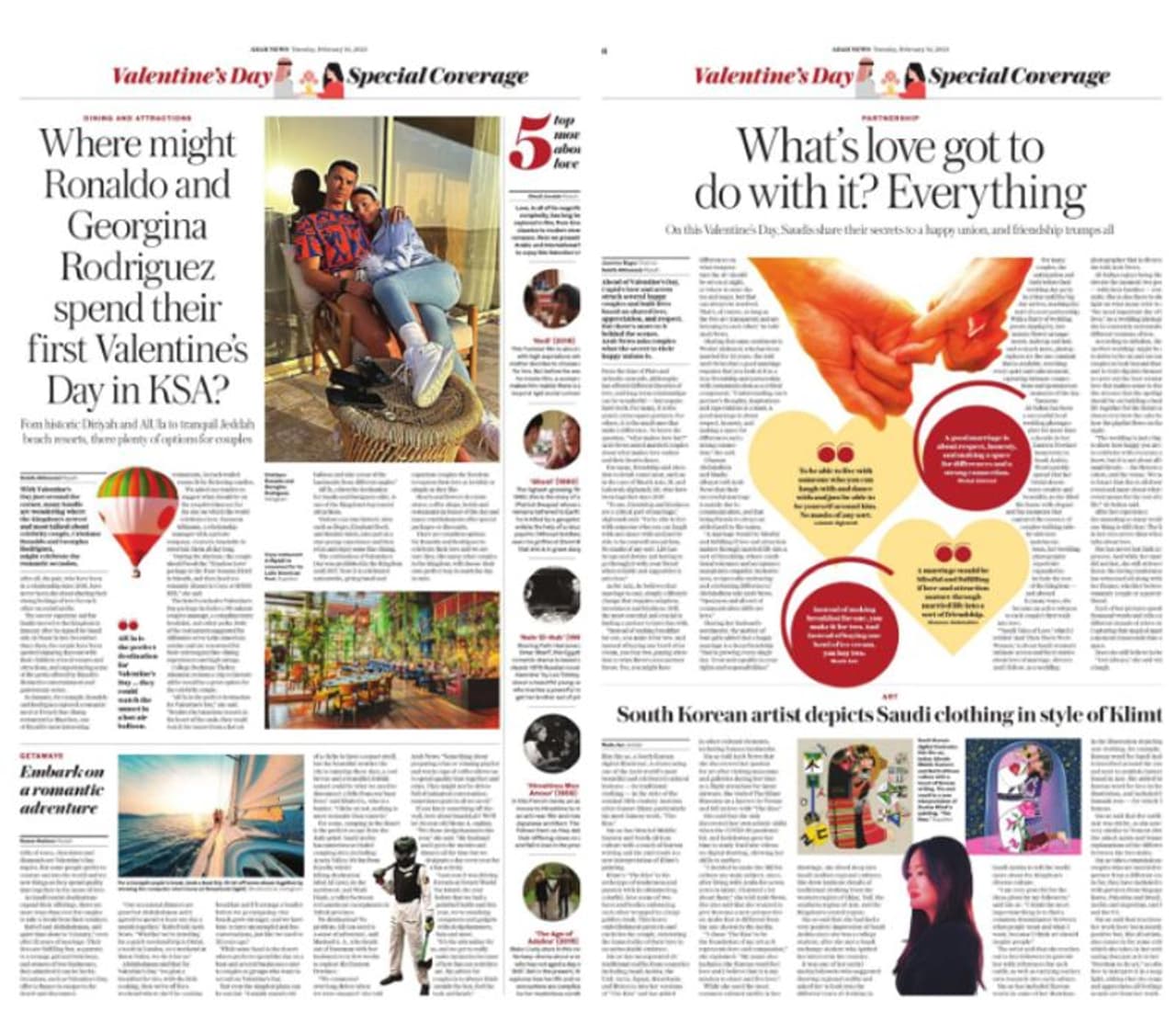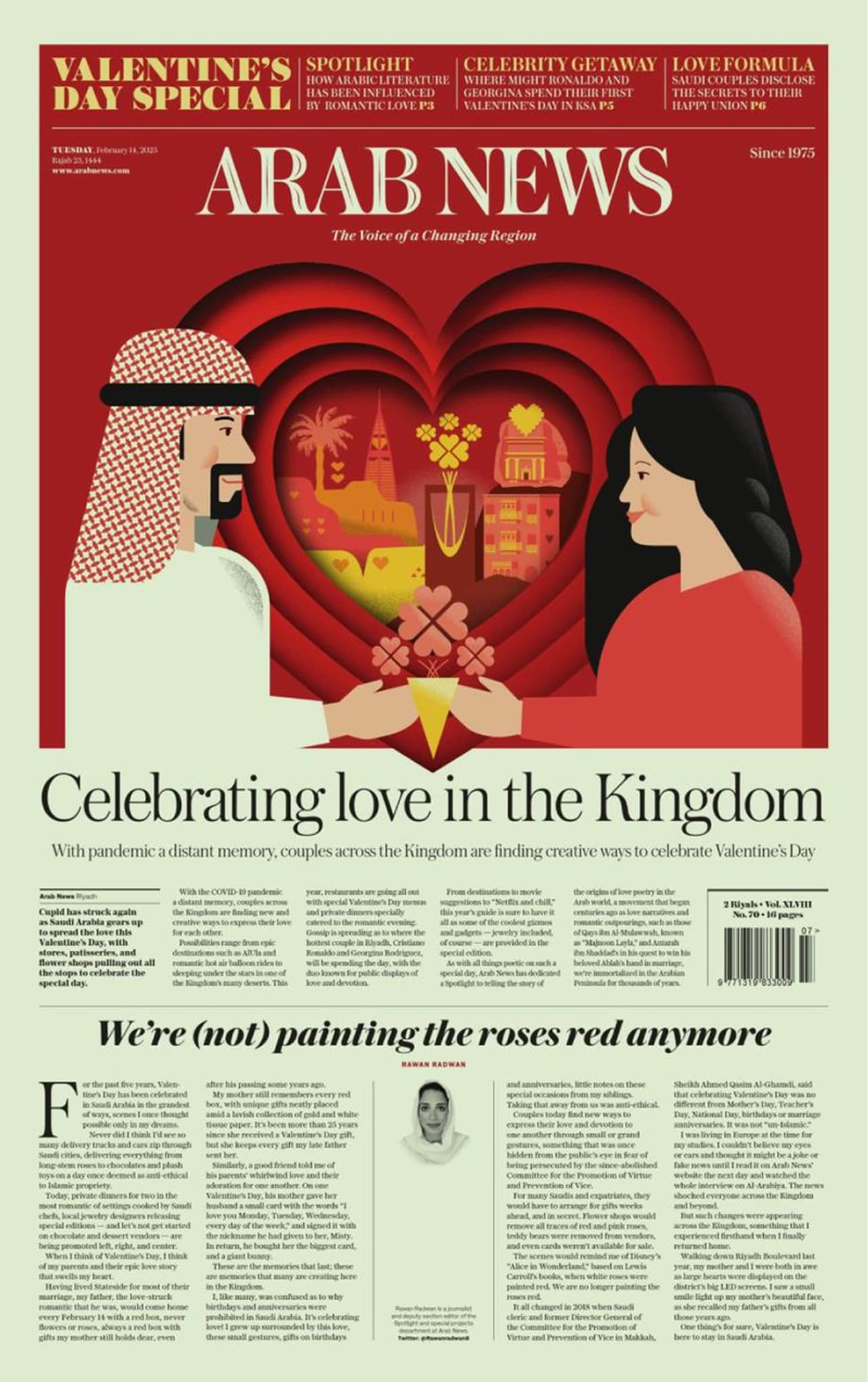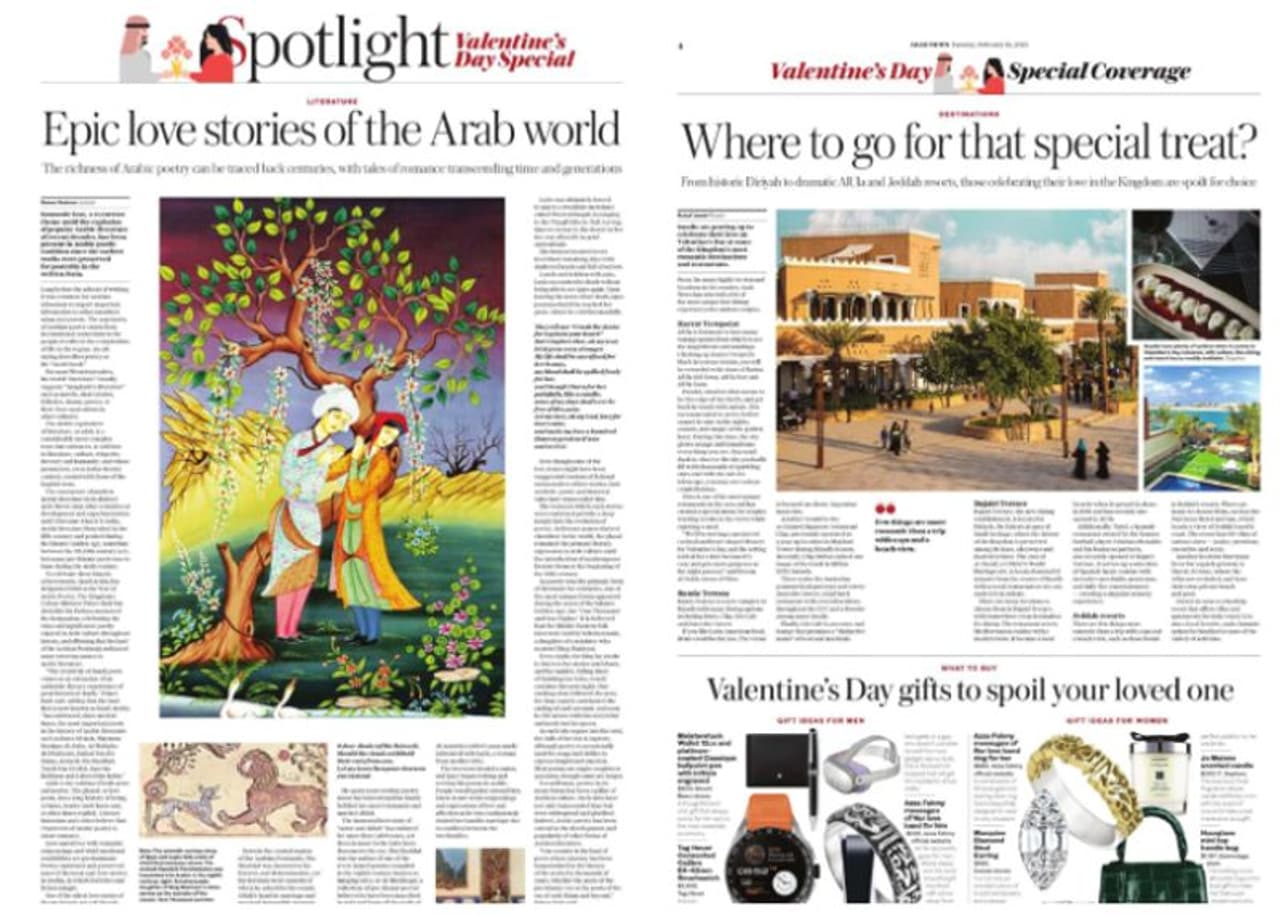 മഹാമാരിയുടെ അസുഖകരമായ ഓർമകളെ അഗണ്യകോടിയിൽ തള്ളി, രാജ്യത്തുടനീളമുള്ള ദമ്പതികളും പ്രണയികളും വാലന്റൈൻസ് ദിനം ആഘോഷിക്കാൻ സർഗാത്മക മാർഗങ്ങൾ കണ്ടെത്തുകയാണെന്ന് മുഖപ്പേജിൽ എഴുതിയ അറബ് ന്യൂസ് ഉള്ളിൽ നാല് താളുകളിലായി പ്രണയത്തിന്റെ അറേബ്യൻ ഇതിഹാസ കഥകളും പ്രണയികൾക്ക് ഒത്തുകൂടാനും സമയം ചെലവഴിക്കാനുമുള്ള മനോഹര സ്ഥലങ്ങളുടെ വിവരണവും സെലിബ്രിറ്റി ദമ്പതികളുടെ ആഘോഷ ഫീച്ചറുമടക്കം രുചിവിഭവങ്ങളുൾപ്പെടുത്തി സമൃദ്ധമായ വാലന്റൈൻസ് ഡേ സ്പെഷ്യൽ പതിപ്പും പ്രസിദ്ധീകരിച്ചു.