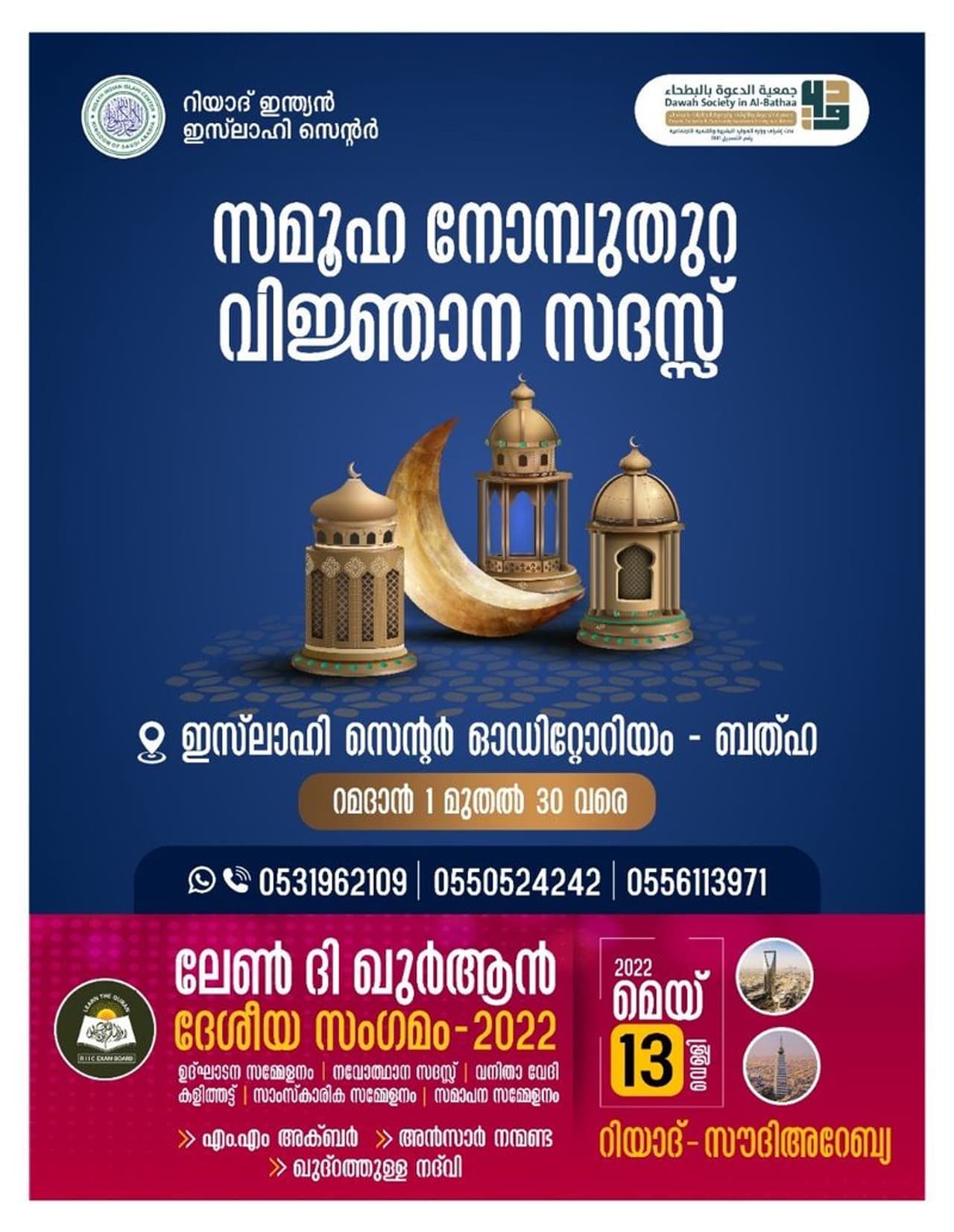 റമദാനിലെ എല്ലാ ദിനങ്ങളിലും അസര് നമകാരത്തോടെ ഇഫ്താര് ഓഡിറ്റോറിയം പ്രവര്ത്തനമാരംഭിക്കും. ഇസ്ലാമിക വിജ്ഞാന സദസ്സുകളും, വിഷയാധിഷ്ഠിത പഠന ക്ലാസ്സുകളും, ലേണ് ദി ഖുര്ആന് പാഠപുസ്തക സൗജന്യ വിതരണവും, മത വിജ്ഞാനങ്ങളിലുള്ള സംശയ നിവാരണവും ഇഫ്താറിനോട് അനുബന്ധിച്ച് സംഘടിപ്പിക്കുമെന്ന് ബത്ഹ ദഅ്വ&അവൈര്നസ് സെന്റര് മലയാള വിഭാഗം ദാഈ മുഹമ്മദ് കുട്ടി കടന്നമണ്ണ അറിയിച്ചു.