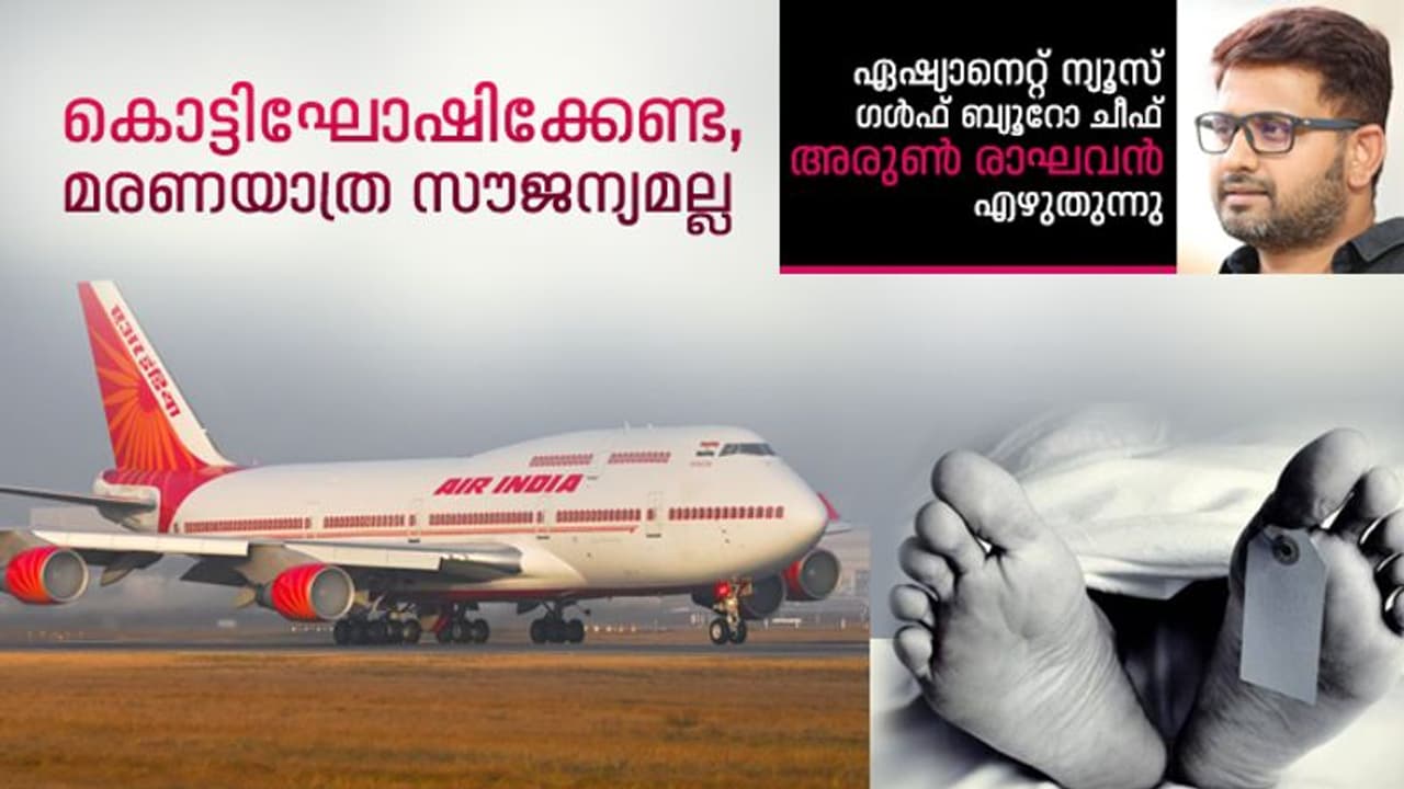 നമ്മുടെ അയൽരാജ്യങ്ങളായ പാകിസ്താനും ബംഗ്ലാദേശും വരെ തങ്ങളുടെ പൗരന്മാരുടെ മൃതദേഹങ്ങൾ പൂർണമായും സൗജന്യമായി നാട്ടിലെത്തിക്കുമ്പോഴാണ്, നിരക്ക് ഏകീകരിച്ചുവെന്ന് പറഞ്ഞുകൊണ്ട് ഇന്ത്യക്കാരന് ആശ്വാസം കൊള്ളുന്നത്. - ഏഷ്യാനെറ്റ് ന്യൂസ് ഗള്ഫ് ബ്യൂറോ ചീഫ് അരുണ് രാഘവന് എഴുതുന്നു