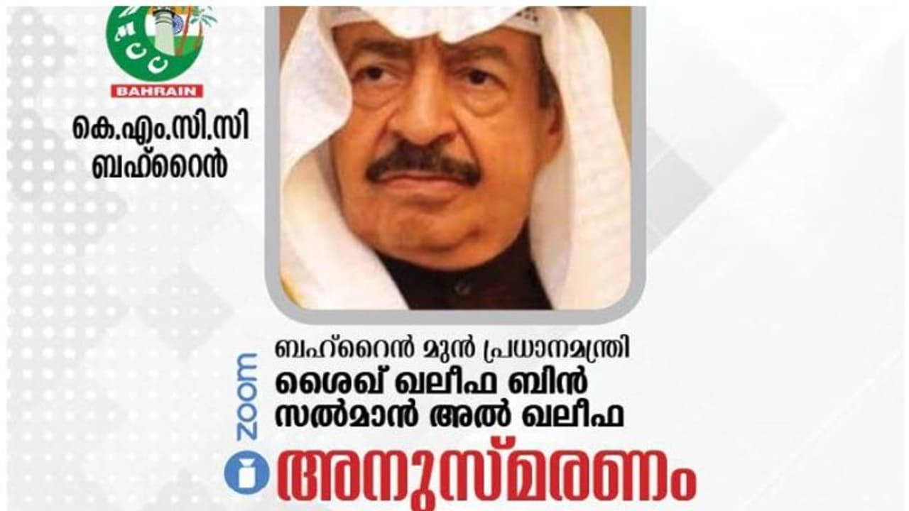 മനാമ: ബഹ്റൈന് മുന് പ്രധാനമന്ത്രിയും പ്രവര്ത്തനങ്ങളിലൂടെ ജനപ്രിയനായി മാറിയ ഭരണാധികാരിയുമായിരുന്ന ശൈഖ് ഖലീഫ ബിന് സല്മാന് അല് ഖലീഫയുടെ വിയോഗത്തില് കെ.എം.സി.സി സംസ്ഥാന കമ്മിറ്റി നടത്തുന്ന അനുസ്മരണം ഞായറാഴ്ച നടക്കും. സൂമിലൂടെ വൈകുന്നേരം 5.15ന് (ഇന്ത്യന് സമയം 7.45) ന് നടക്കുന്ന ഓണ്ലൈന് സംഗമം പ്രമുഖ വ്യവസായി പത്മശ്രീ എം.എ യൂസഫലി ഉദ്ഘാടനം ചെയ്യും.