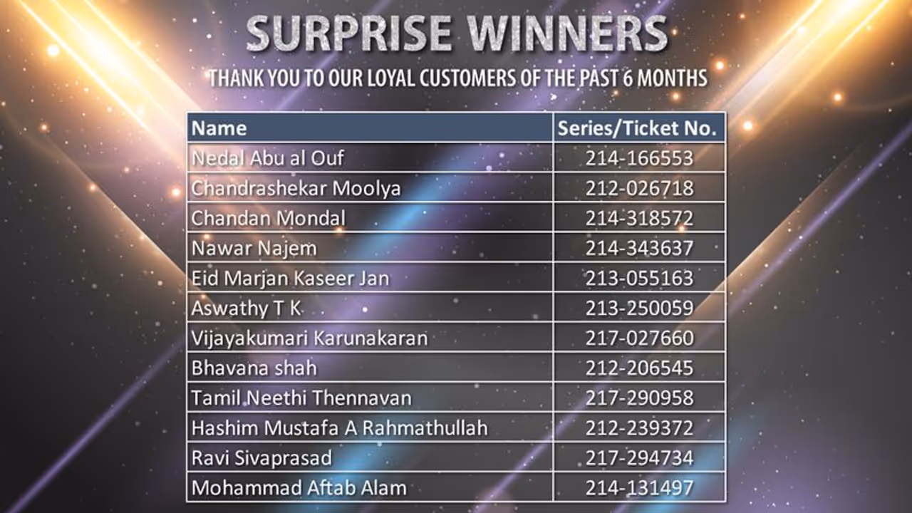 വിജയികളുടെ പേരുകള്, അവര് നേരത്തെ ടിക്കറ്റെടുത്തിരുന്ന സീരീസ്, ടിക്കറ്റ് നമ്പര് എന്നിവ