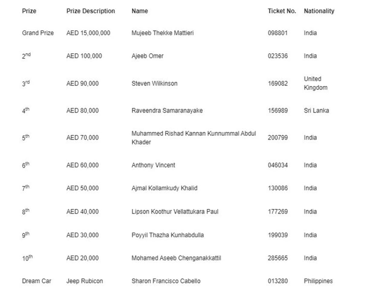 ബിഗ് ടിക്കറ്റ് ലൈവ് നറുക്കെടുപ്പിൽ പുത്തൻ ജീപ് റൂബികോൺ സ്വന്തമാക്കിയത് ഷാരൺ ഫ്രാൻസിസ്കോ കാബെല്ലോയാണ്. കഴിഞ്ഞ ഓഗസ്റ്റിൽ ഒരു പുത്തൻ ബി.എം.ഡബ്ല്യു കാര് ഫിലിപ്പീൻസിൽ നിന്നുള്ള ഷാരൺ നേടിയിട്ടുണ്ട്. 2014 മുതൽ യു.എ.ഇയിൽ ജീവിക്കുന്ന ഷാരൺ അബുദാബിയിലാണ് താമസം.