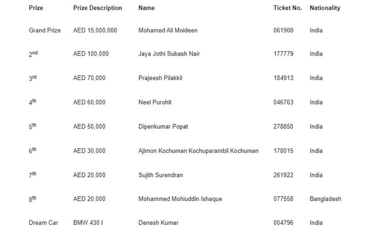 ബിഗ് ടിക്കറ്റ് സീരിസ് 253 ലൈവ് നറുക്കെടുപ്പിൽ 15 മില്യൺ ദിർഹം ഗ്രാൻഡ് പ്രൈസ് നേടിയത് മുഹമ്മദ് അലി മൊയ്ദീൻ എന്ന ഇന്ത്യൻ പൗരൻ. യു.എ.ഇയിൽ ഒരു കൺസ്ട്രക്ഷൻ കമ്പനിയിൽ അക്കൗണ്ട് മാനേജറായി ജോലിനോക്കുന്ന മുഹമ്മദ് 32 വർഷമായി പ്രവാസിയാണ്.