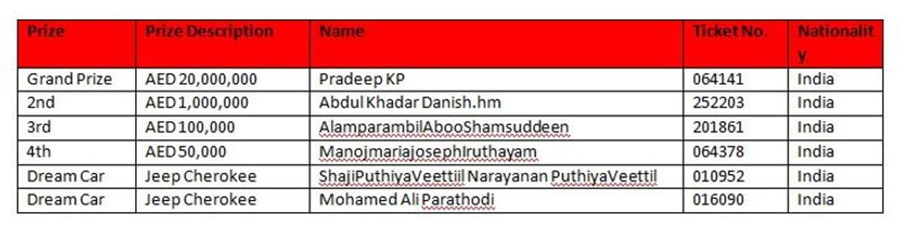 കഴിഞ്ഞ ദിവസം നടന്ന ബിഗ് ടിക്കറ്റിന്റെ 244-ാം സീരീസ് 'മൈറ്റി - 20 മില്യന്' നറുക്കെടുപ്പില് എല്ലാ സമ്മാനങ്ങളും ഇന്ത്യക്കാര്ക്ക് തന്നെയായിരുന്നു. അബ്ദുല് ഖാദര് ഡാനിഷ് ആണ് രണ്ടാം സമ്മാനമായ 10 ലക്ഷം ദിര്ഹം സ്വന്തമാക്കിയത്. 252203 എന്ന നമ്പറിലുള്ള ടിക്കറ്റിലൂടെയാണ് അദ്ദേഹത്തിന് 1,000,000 ദിര്ഹം ലഭിച്ചത്. മൂന്നാം സമ്മാനമായ 100,000 ദിര്ഹം സ്വന്തമാക്കിയത് ആലമ്പറമ്പില് അബൂ ഷംസുദ്ദീനാണ്. 201861 എന്ന ടിക്കറ്റ് നമ്പറിലൂടെയാണ് അദ്ദേഹം സമ്മാനാര്ഹനായത്. 064378 എന്ന ടിക്കറ്റ് നമ്പറിലൂടെ മനോജ് മരിയ ജോസഫ് ഇരുത്തയം 50,000 ദിര്ഹത്തിന്റെ നാലാം സമ്മാനം സ്വന്തമാക്കി.