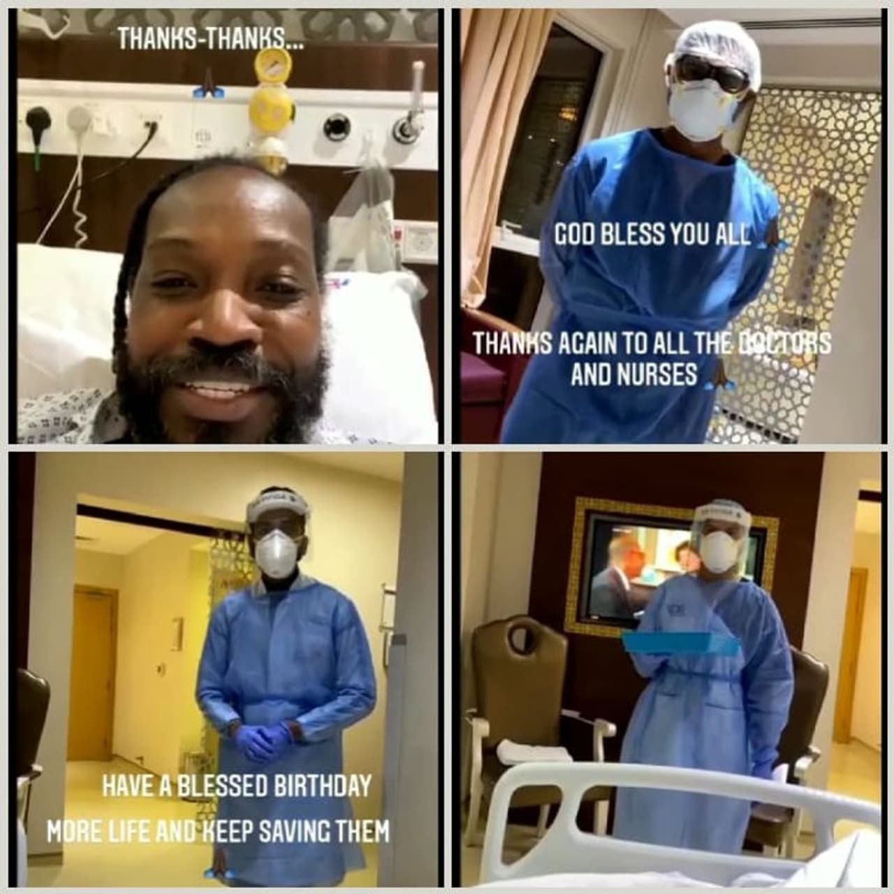 'ഞാന് ഇപ്പോള് ഡോക്ടറുടെ ഓഫീസിലാണ്. എന്റെ ഓഫീസില് എന്നും പറയാം. ഇന്ന് ഒരു പ്രത്യേക വ്യക്തി എനിക്കൊപ്പമുണ്ട്. ഡോ തൗസീഫ്. എന്നെ പരിചരിച്ചതിനു നന്ദി. ഇതോടൊപ്പം വിജി, ഡോക്ടര് ഷഫീഖ്. ആശുപത്രിയിലെ പരിചരണത്തിന് നന്ദി. വളരെ മികച്ച രീതിയിലാണ് ഇവര് എന്നെ പരിചരിച്ചത്. ഡോക്ടറും നഴ്സും രാത്രി മുഴുവന് എന്നെ പരിചരിക്കാനായി നിന്നു. യൂണിവേഴ്സല് ബോസായ ക്രിസ് ഗെയ്ല് ശക്തനായിരിക്കാനും തിരിച്ചുവരവ് ഉറപ്പാക്കാനും വേണ്ടിയാണ് ഇവര് പ്രയത്നിച്ചത്. തുടര്ന്നും ഞങ്ങളെ പ്രചോദിപ്പിക്കുക. ജീവനുകള് രക്ഷിക്കുക. ബുദ്ധിമുട്ടേറിയ സമയത്തിലൂടെയാണ് നമ്മള് കടന്നു പോകുന്നത് അതുകൊണ്ടു തന്നെ നിങ്ങളുടെ സേവനത്തെ അഭിനന്ദിക്കുന്നു'- ഗെയ്ല് പറഞ്ഞു.