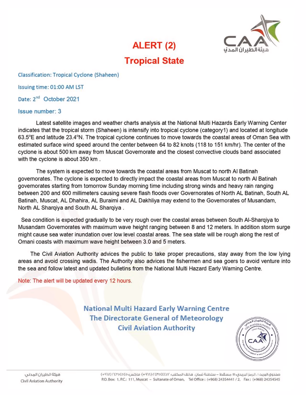 ഷഹീന് ചുഴലിക്കാറ്റ് ഒമാന് തീരത്ത് നിന്നും 500 കിലോമീറ്റര് അകലെയാണ് ഇപ്പോള് നിലകൊള്ളുന്നതെന്ന് ഒമാനി മെട്രോളജിക്കല് അതോറിറ്റി സ്ഥിരീകരിച്ചിട്ടുണ്ട്.