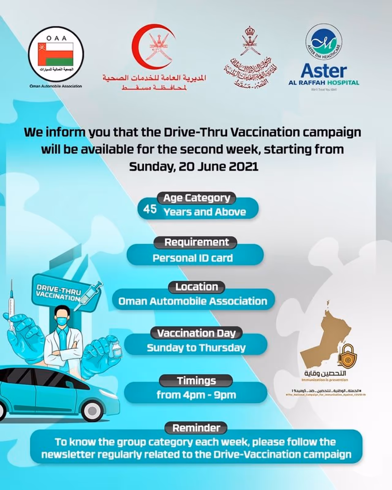 മസ്കറ്റ്: ജൂണ് 13 മുതല് ഒമാന് ഓട്ടോമൊബൈല് അസ്സോസിയേഷനില് ആരംഭിച്ച കൊവിഡ് പ്രതിരോധ ഡ്രൈവ് ത്രൂ വാക്സിനേഷന് രണ്ടാമത്തെ ആഴ്ചയും തുടരുമെന്ന് ഒമാന് ആരോഗ്യ മന്ത്രാലയം അറിയിച്ചു. 45 വയസ്സും അതിനു മുകളിലും പ്രായമുള്ളവര്ക്കുള്ള വാക്സിന് സ്വീകരിക്കുവാന് ഈ സംവിധാനം ഉപയോഗപ്പെടുത്താന് കഴിയുമെന്ന് മന്ത്രാലയത്തിന്റെ പ്രസ്താവനയില് പറയുന്നു. ഞായര് മുതല് വ്യാഴം വരെ വൈകുന്നേരം 4 മണി മുതല് 9 വരെയായിരിക്കും വാക്സിന് ലഭിക്കുക.