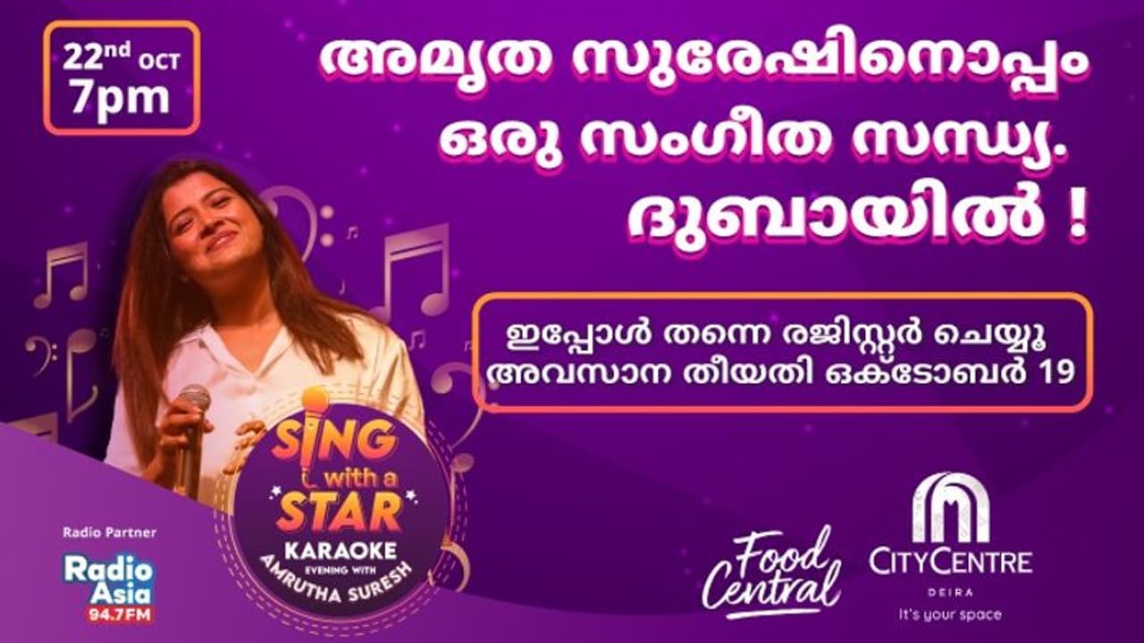 മലയാളികൾക്ക് സെലിബ്രിറ്റി ഗായിക അമൃത സുരേഷിനൊപ്പം പാടാനുള്ള അവസരമാണ് സിറ്റി സെന്റർ ദെയ്റയിലെ ഫുഡ് സെൻട്രലിൽ നടക്കുന്ന കരോക്കെ സന്ധ്യ. പരിപാടിയിൽ സൗജന്യമായി രജിസ്റ്റർ ചെയ്യുന്നവർക്ക് തങ്ങളുടെ പ്രിയപ്പെട്ട ഗാനങ്ങൾ കരോക്കെയായി പാടാം, അമൃത സുരേഷിനൊപ്പം വേദി പങ്കിടാം. പാട്ടുകൾക്ക് ഒപ്പം മൂളിയും, പ്രോത്സാഹനം നൽകിയും, ആരാധകരെ സംഗീതത്തിലേക്ക് ക്ഷണിച്ചും അമൃത സുരേഷ് വേദിയിലുണ്ടാകും.