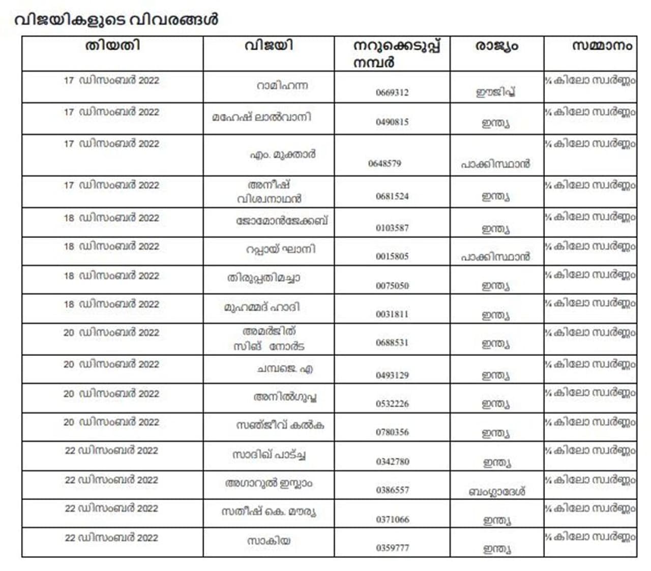 - ഭാഗ്യശാലികളെ കാത്തിരിക്കുന്നത് മൊത്തം 25 കിലോ സ്വര്ണം. 2023 ജനുവരി 29 വരെയുള്ള ഒന്നിടവിട്ട ദിവസങ്ങളിലും 4 വിജയികള്ക്ക് നറുക്കെടുപ്പിലൂടെ 250 ഗ്രാം സ്വര്ണം വീതം സമ്മാനമായി ലഭിക്കുന്നു.
