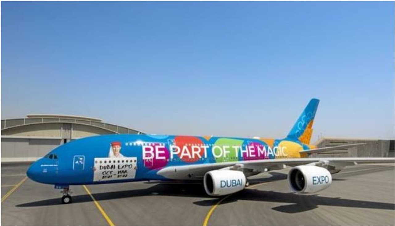 'സീ യു ദെയര്' എന്ന് എഴുതിയ, നീല നിറം പൂശിയ വിമാനത്തിന് പച്ച, ഓറഞ്ച്, പിങ്ക്, പര്പ്പിള്, ചുവപ്പ് എന്നിങ്ങനെ ആകര്ഷകമായ നിറങ്ങളും നല്കിയിട്ടുണ്ട്. വിമാനത്തിന്റെ ചിറകുകള്ക്ക് താഴെയുള്ള എഞ്ചിന് കൗളുകളില് എക്സ്പോയുടെ തീയതിയും കുറിച്ചിട്ടുണ്ട്. മൂന്ന് വിമാനങ്ങളാണ് എമിറേറ്റ്സ് എക്സ്പോയ്ക്കായി രൂപമാറ്റം വരുത്തുന്നത്.